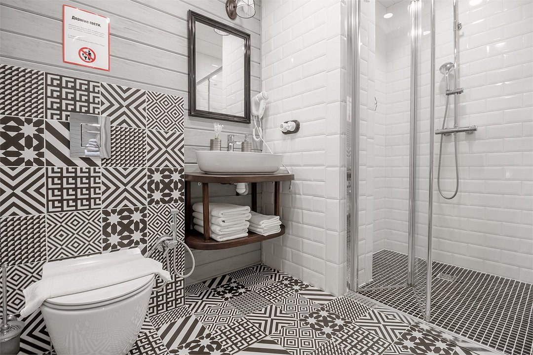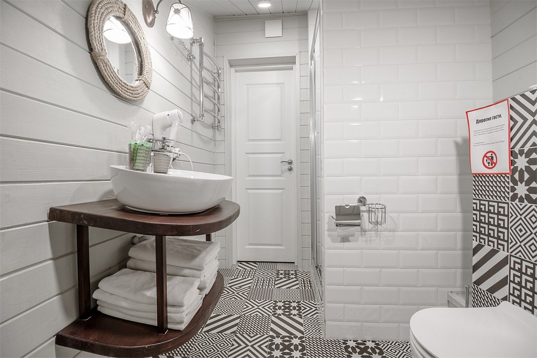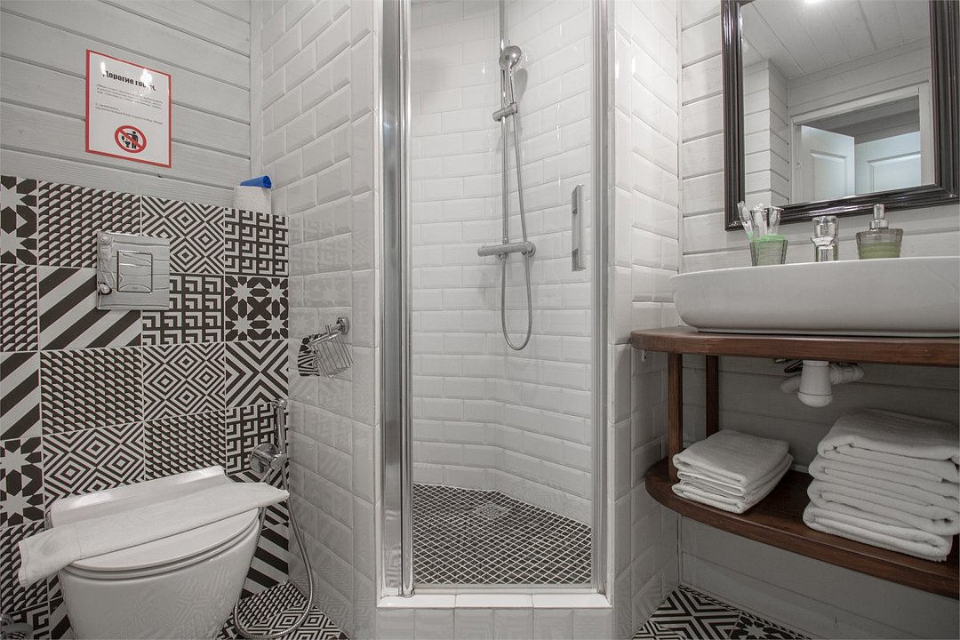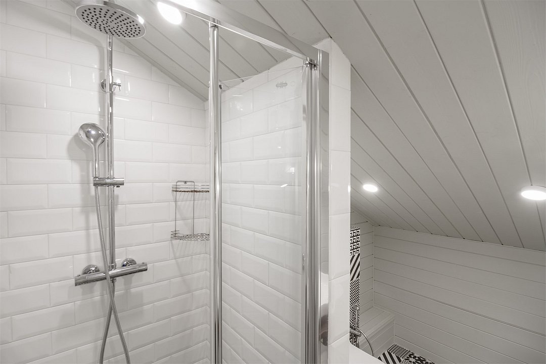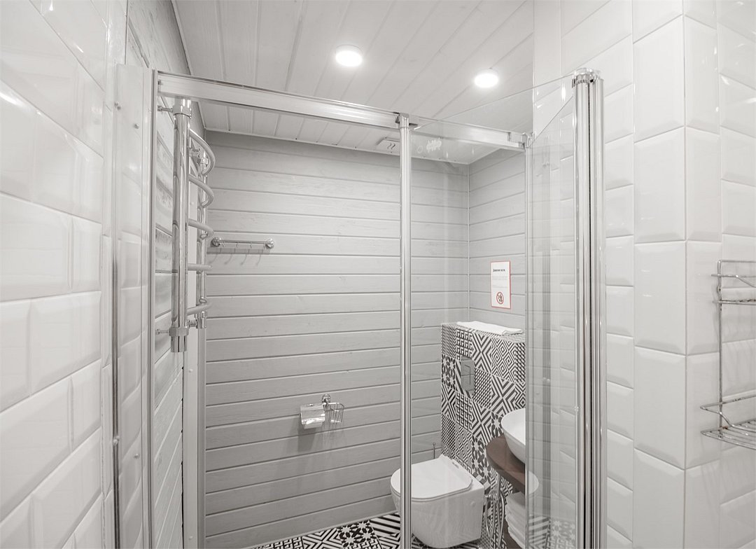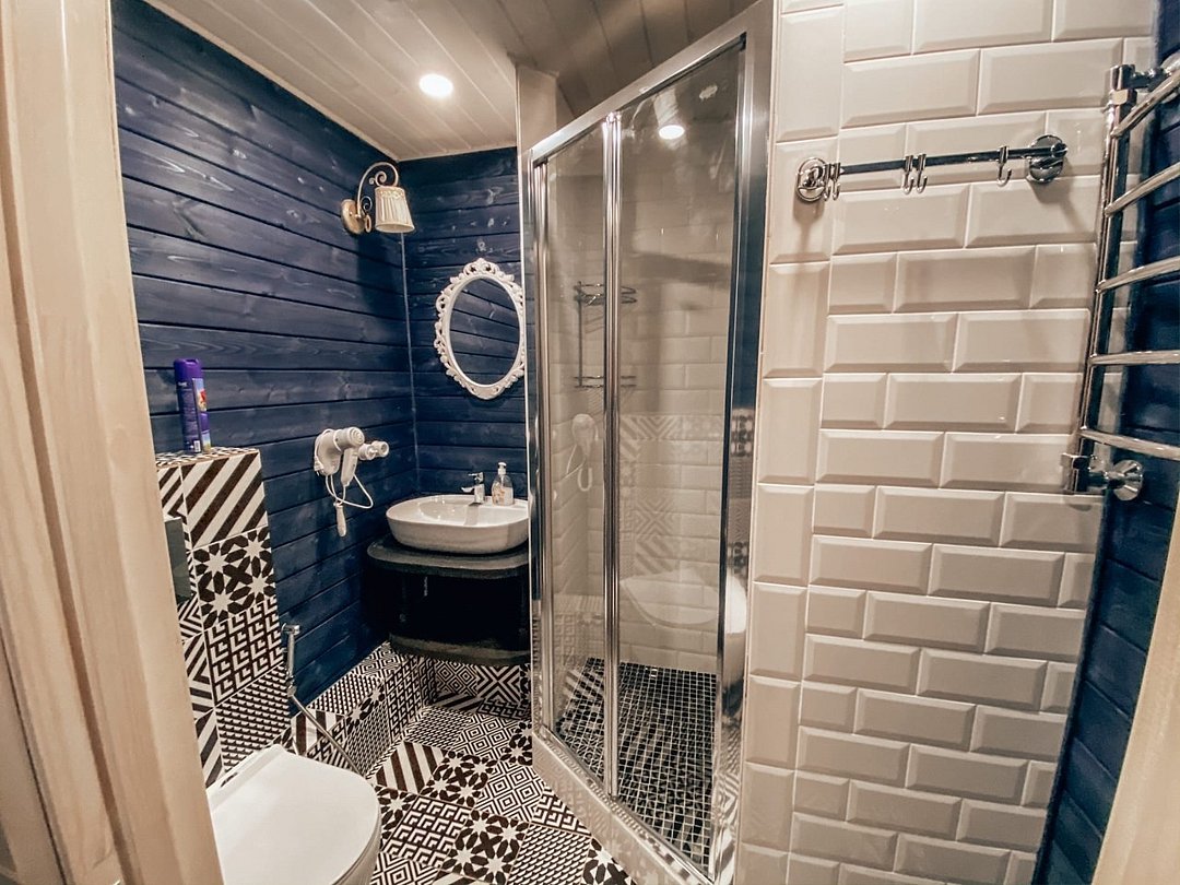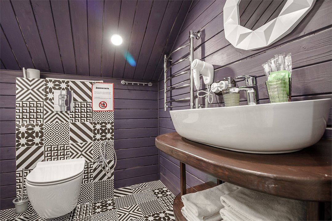 Санузел и душевая, оборудованные обливным ведром, добавляют изысканности и удобства. На собственной террасе под открытым небом расположены уютные купели — теплые и холодные, — которые создают атмосферу умиротворения.