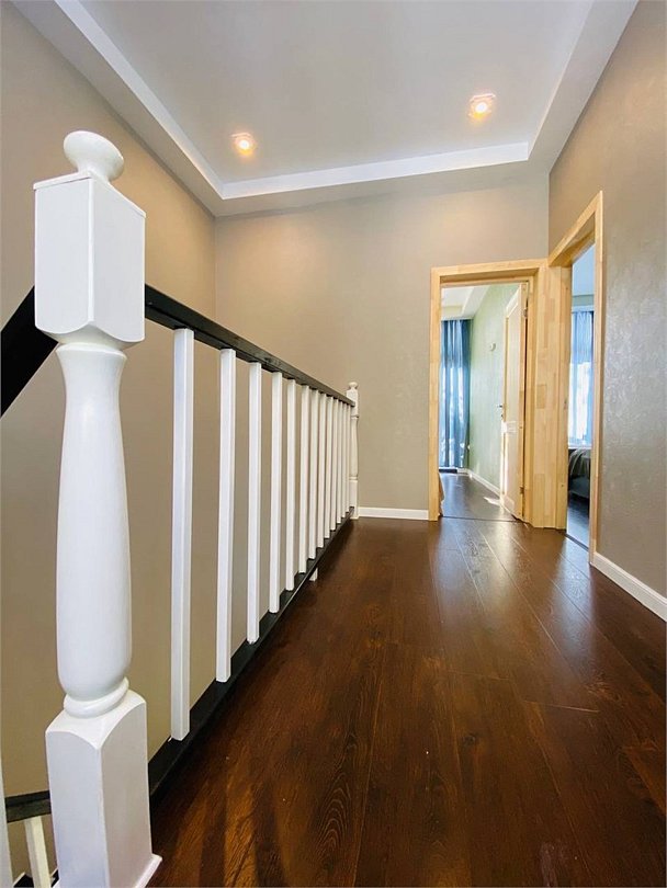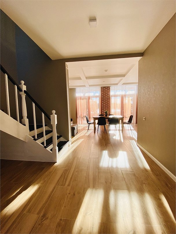 В доме три спальни, гостевая зона и оборудованная кухня. Сам таун-хаус, как и полагается, двухэтажный. Санузел совмещенный, располагается на первом этаже.