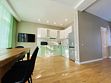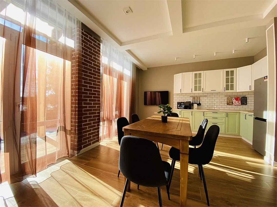 Кухня оборудована двухконфорочной варочной панелью, микроволновой печью, посудомоечной машиной, большим холодильником с морозильной камерой, чайником. Посуда, кухонная утварь входит в стоимость аренды.
