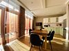 Кухня оборудована двухконфорочная варочной панелью, микроволновой печью, большим холодильником с морозильной камерой, чайником, посудомоечной машиной. Посуда, кухонная утварь входит в стоимость аренды.