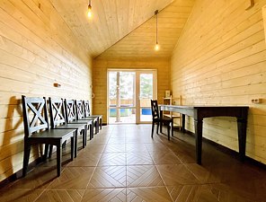 Интерьер бани, выполненный из дерева, поражает своей гармонией и уютом. Просторный гостевой зал с телевизором и обеденным столом создает атмосферу комфорта и гостеприимства. Комната отдыха с мягким диваном приглашает к неспешным беседам и отдыху. Парная с панорамным видом на природу дарит незабываемые ощущения.