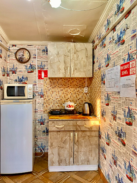 Номер с двухспальной кроватью, с раскладывающимся диванчиком. Санузел (туалет, душевая). Сплит система, обогреватели, плазма со спутниковым ТВ. Кухня: холодильник, микроволновка, эл.плита, эл.чайник, вся необходимая посуда.