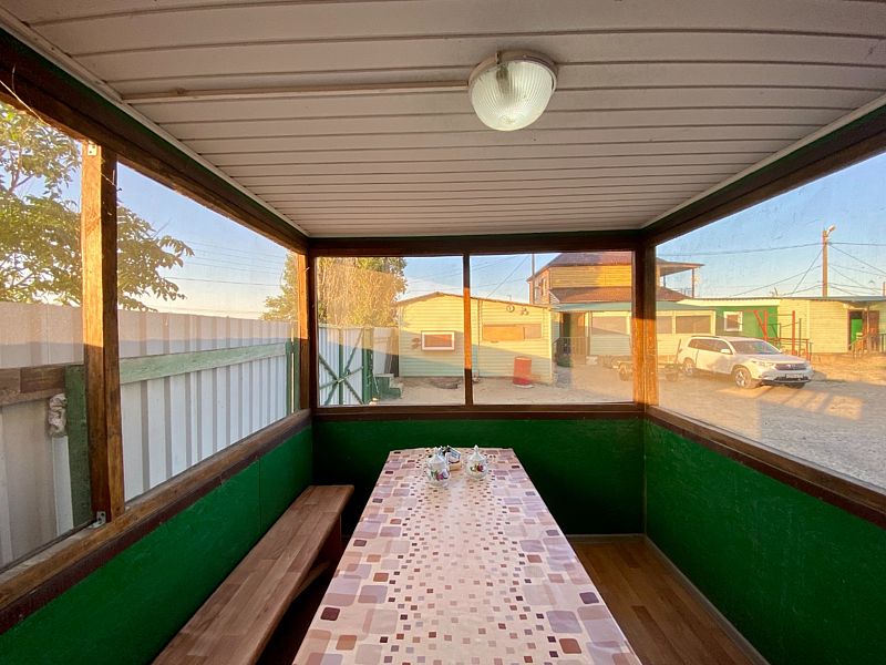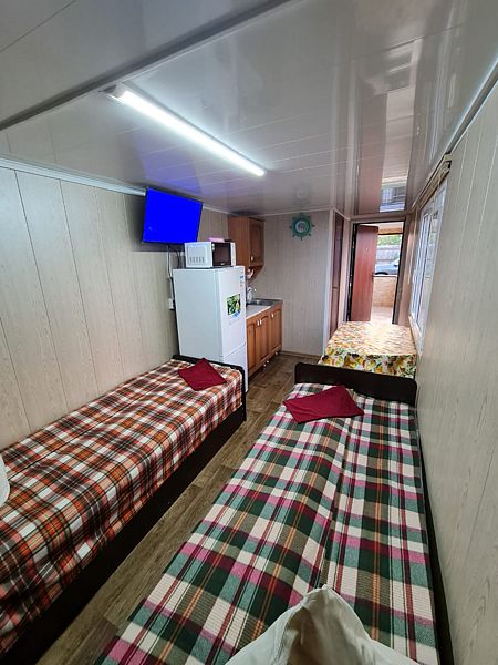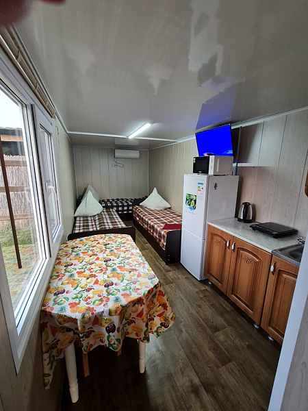 Отдельно стоящий домик, находиться близко от воды. Состоит из основной комнаты и прихожей. Имеется отдельный дворик со столом и лавками. В домике две двух ярусные кровати, стол, табуреты, эл.плита, эл.чайник, микроволновка, холодильник, телевизор со спутниковым ТВ, вся необходимая посуда.
