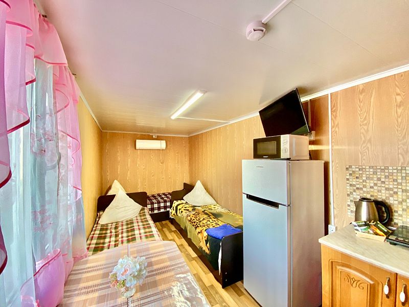 Отдельно стоящий домик. Имеет свой дворик со столом и лавками. Состоит из двух спальных комнат в каждой по три кровати обеденный стол и табуреты, кондиционер и обогреватели. Небольшая кухонька со всей необходимой посудой, эл.плитой, микроволновкой, эл.чайником холодильником.