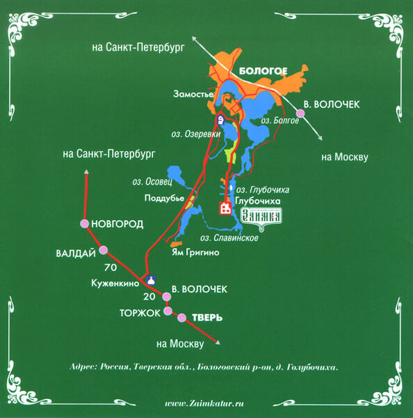 Поездом с Ленинградского вокзала до станции Бологое. Время в пути 4-4,5 часа (скоростным поездом Москва - Санкт - Петербург - 2,5 часа). От станции Бологое до туристского комплекса «Заимка на такси или по предварительному заказу на транспорте комплекса.