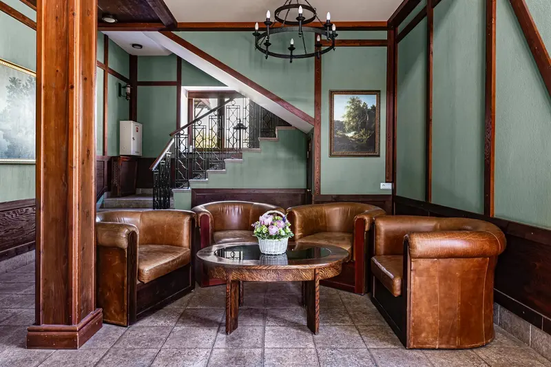 В распоряжении гостей просторная гостиная с камином, комнатой отдыха с кухонной зоной и мягкой мебелью. По вашему желанию вы можете заказать еду и напитки из ресторана прямо в банный комплекс.