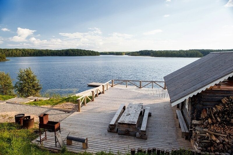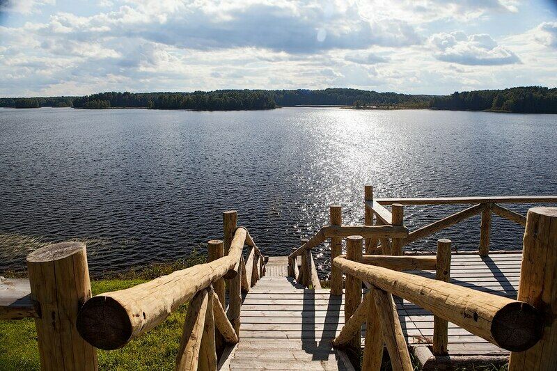 Комфортабельный коттедж на двоих. Находится на первой линии. Из панорамных окон коттеджа открывается прекрасный вид на озеро и окрестности. Наслаждаться спокойствием и гладью лесного озера можно прямо из кровати!