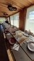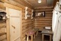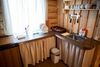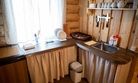 Полностью обустроен для комфортного проживания - печь, газовая плита, моечная раковина, холодильник, разделочный стол и полки с набором посуды и инвентаря.
