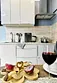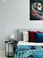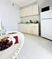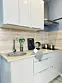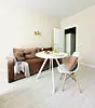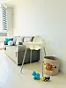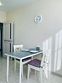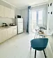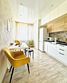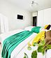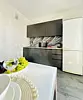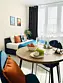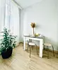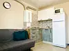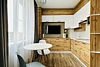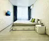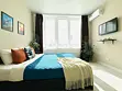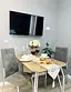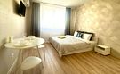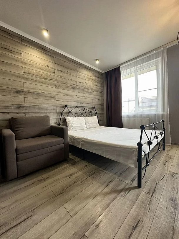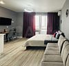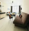 Квартира-студия в современном стиле расположена в самом центре поселка. Двуспальная кровать шириной 140 сантиметров и кресло-кровать для ребенка, комплекты цветного постельного белья и гигиенический набор, высокоскоростной Wi-fi и ТВ, кухня с необходимой техникой, посудой, столовыми приборами, наличие гладильной доски, утюга и фена.