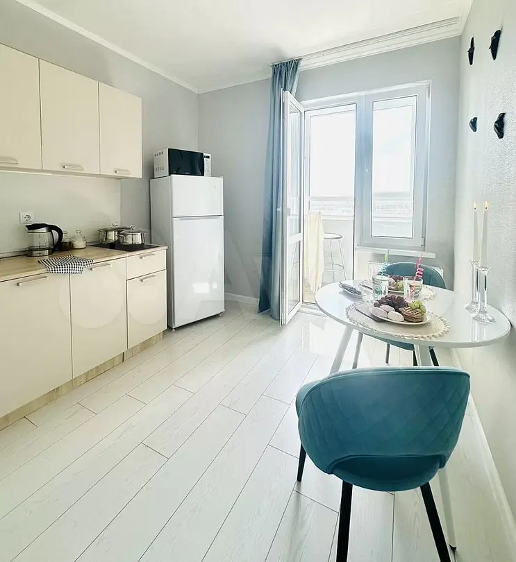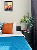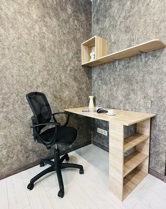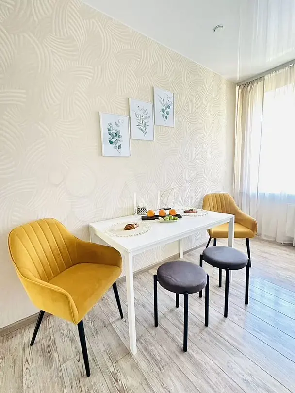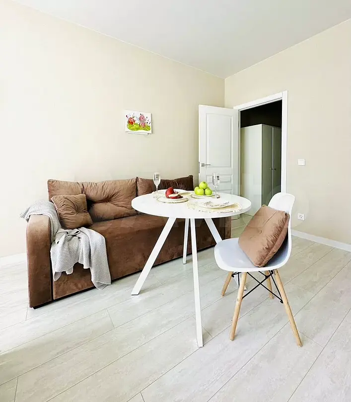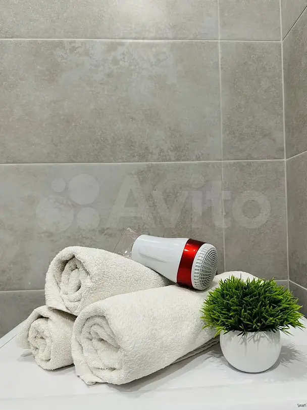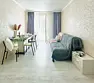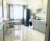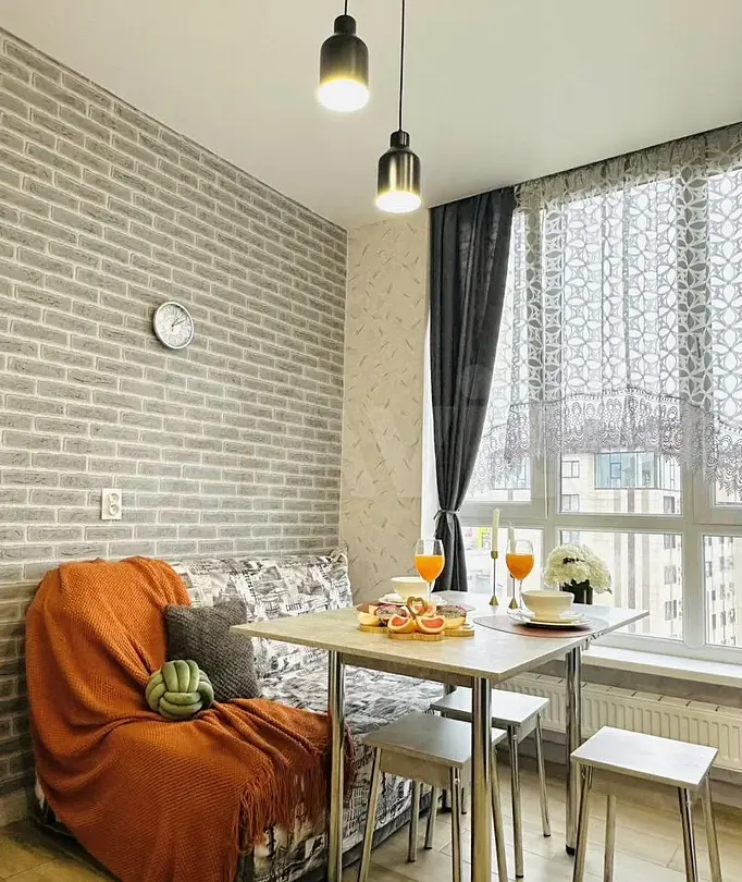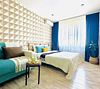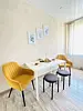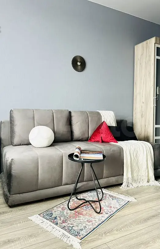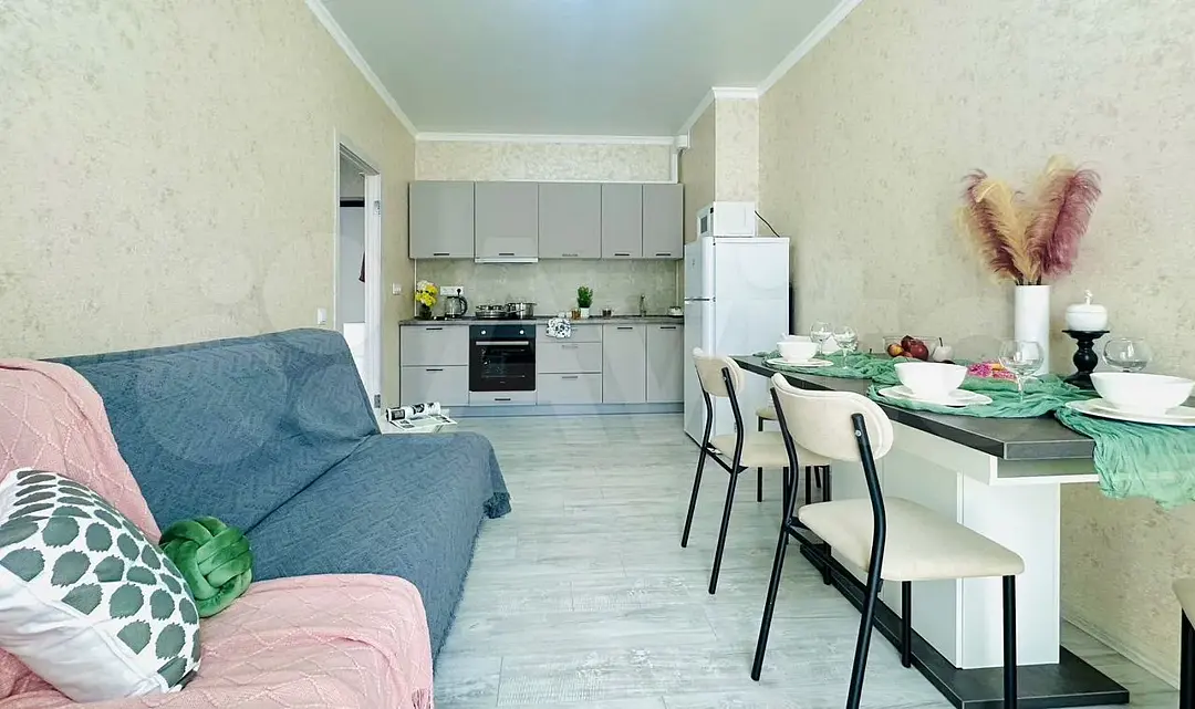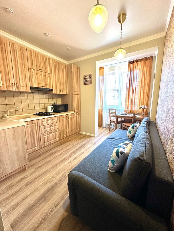 Квартира-студия в современном стиле расположена в самом центре поселка. Двуспальная кровать шириной 160 сантиметров, комплекты цветного постельного белья и гигиенический набор, высокоскоростной Wi-fi и ТВ, кухня с необходимой техникой, посудой, столовыми приборами, наличие гладильной доски, утюга и фена.