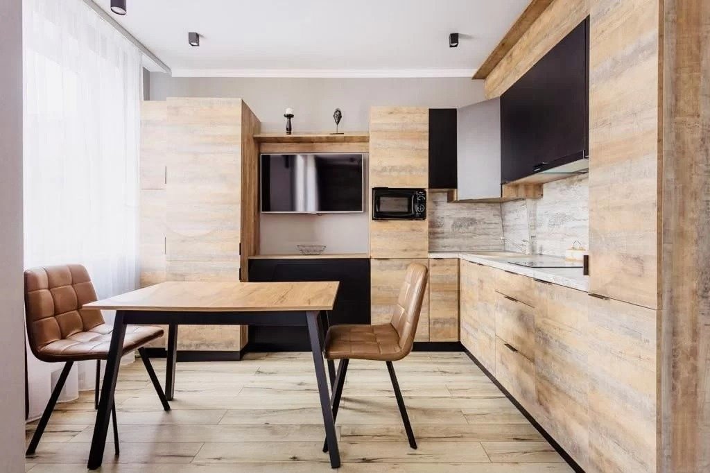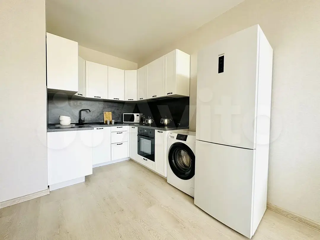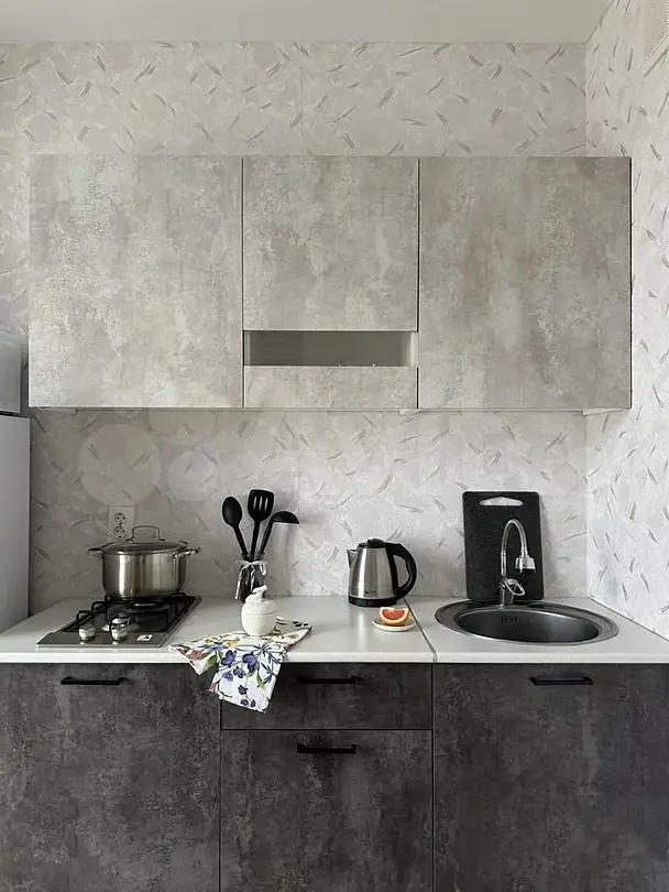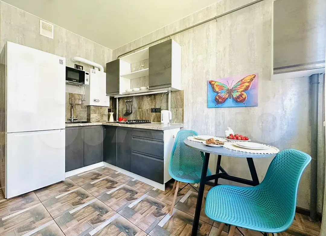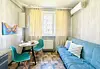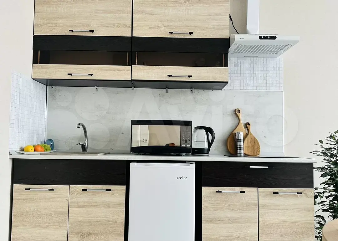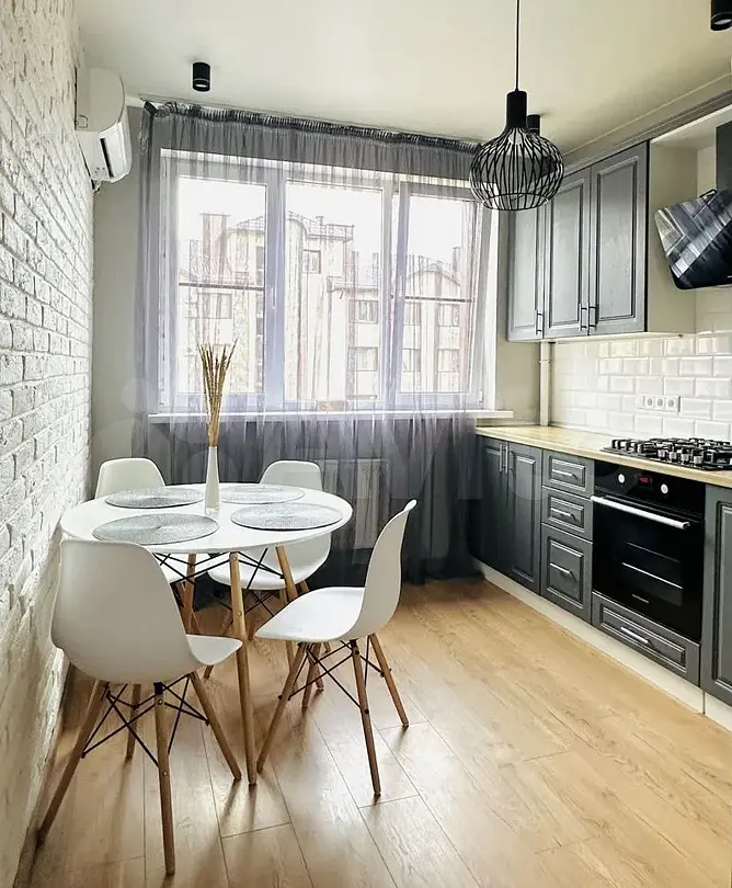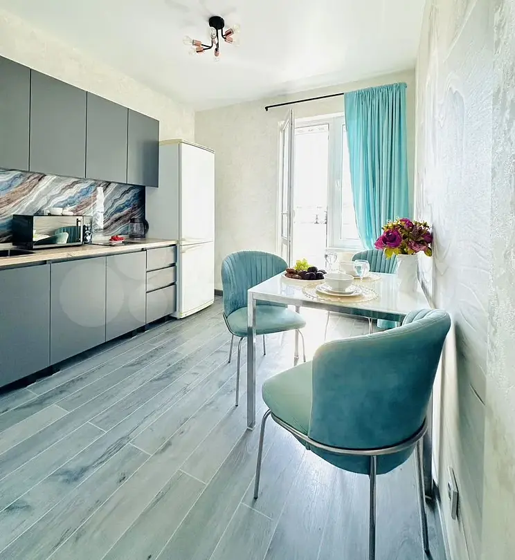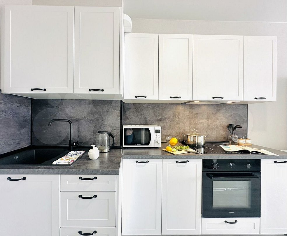 Квартира-студия в современном стиле расположена в самом центре поселка. Двуспальная кровать шириной 160 сантиметров, комплекты цветного постельного белья и гигиенический набор, высокоскоростной Wi-fi и ТВ, кухня с необходимой техникой, посудой, столовыми приборами, наличие гладильной доски, утюга и фена.