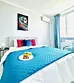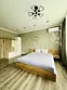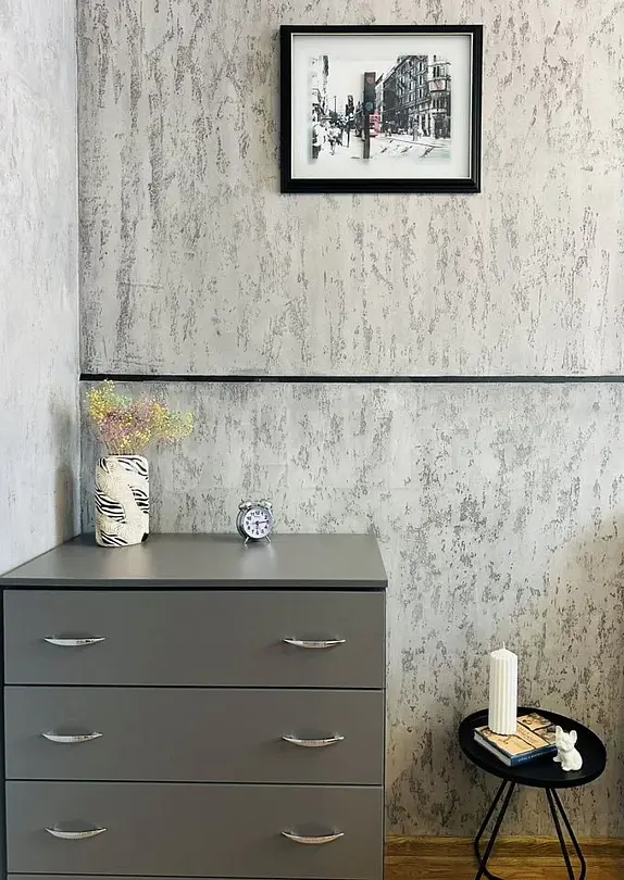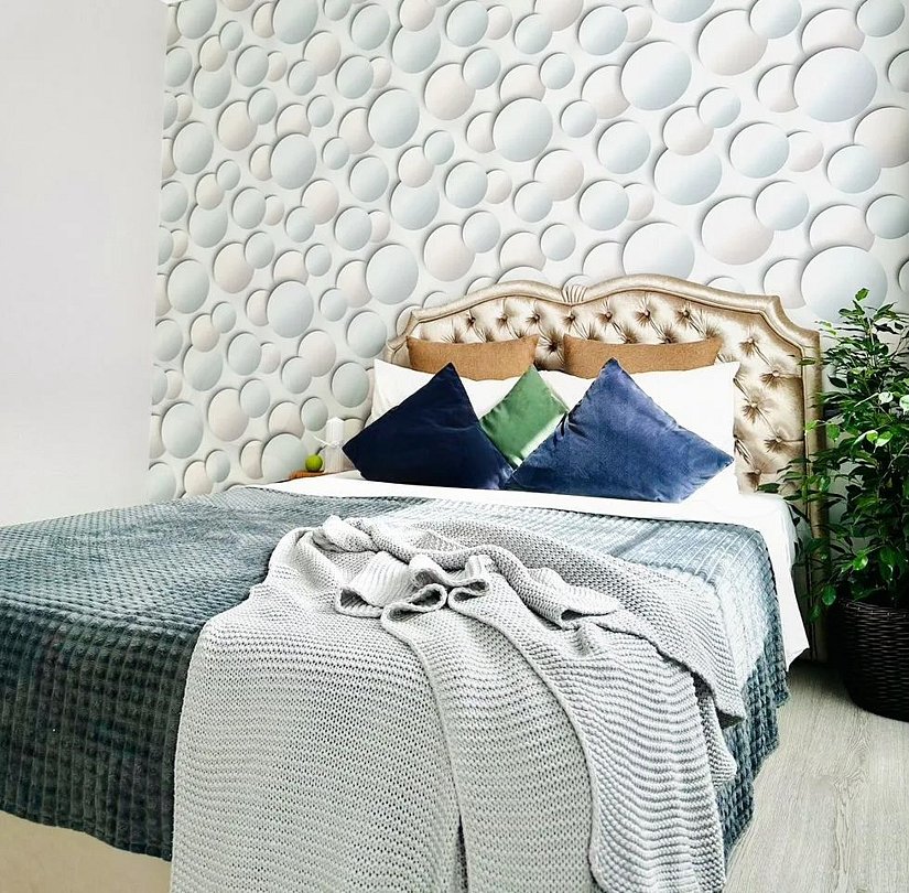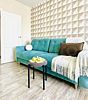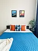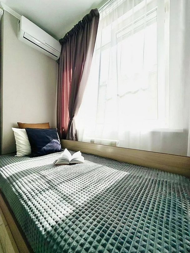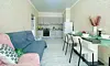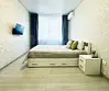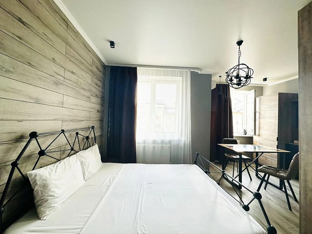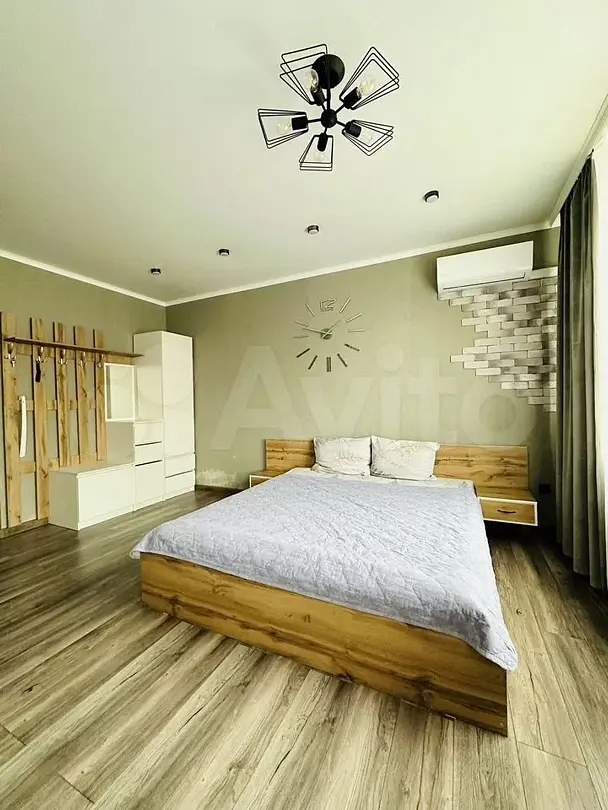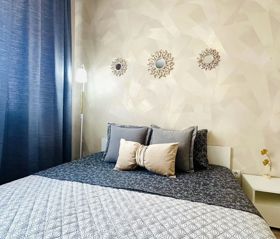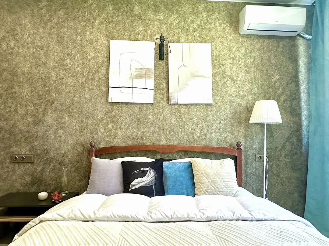 Квартира-студия в современном стиле расположена в самом центре поселка. Двуспальная кровать шириной 160 сантиметров и кресло-кровать для ребенка, комплекты цветного постельного белья и гигиенический набор, высокоскоростной Wi-fi и ТВ, кухня с необходимой техникой, посудой, столовыми приборами, наличие гладильной доски, утюга и фена.