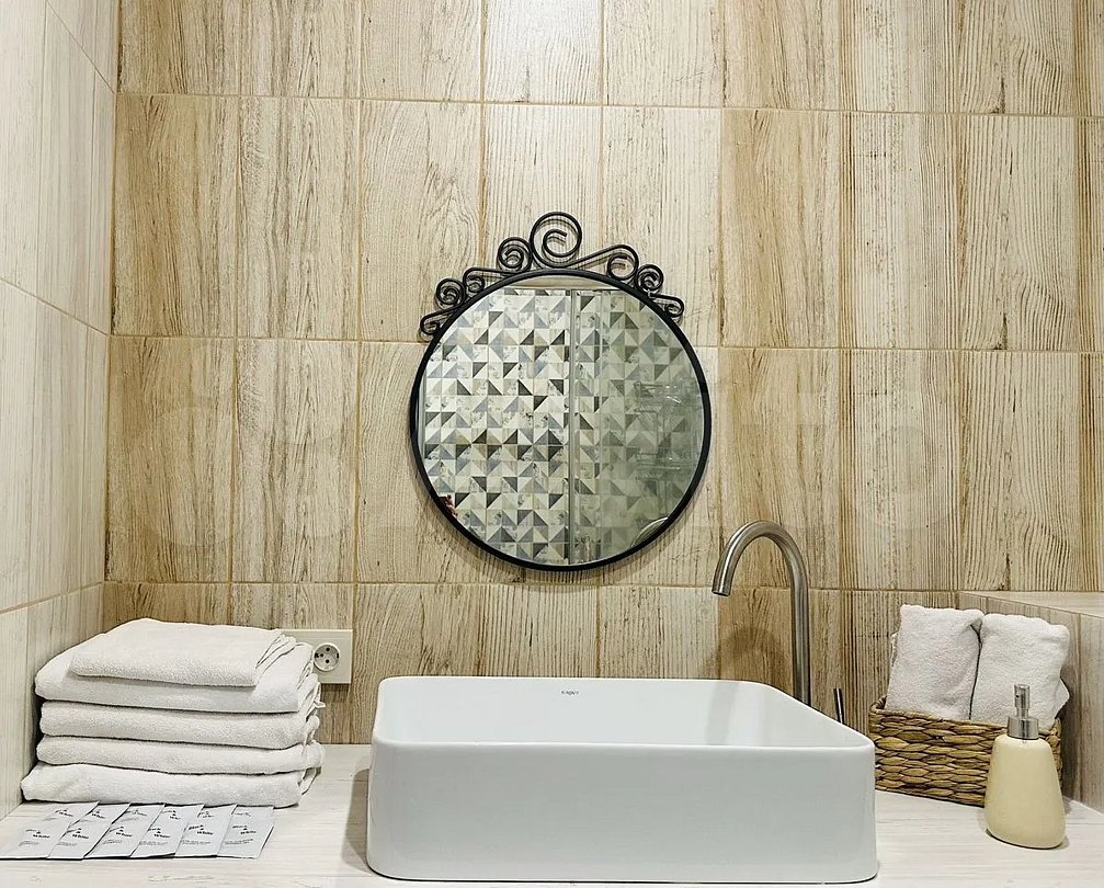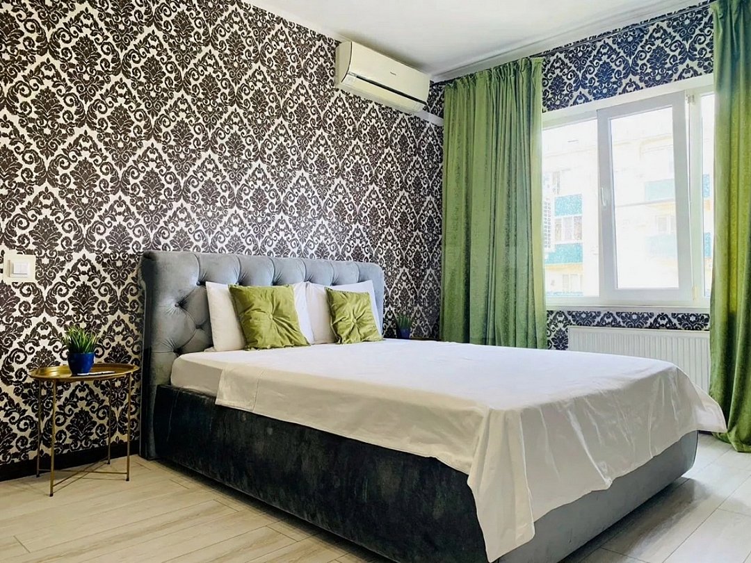 Квартира-студия в современном стиле расположена на территории аула Новая Адыгея. Двуспальная кровать шириной 160 сантиметров и диван, комплекты цветного постельного белья и гигиенический набор, высокоскоростной Wi-fi и ТВ, холодильник, чайник, сахар, чай, наличие гладильной доски, утюга и фена.