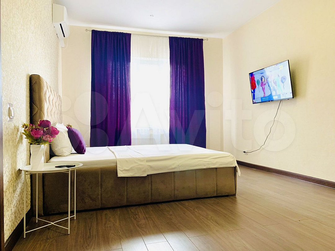 Однокомнатная квартира в современном стиле расположена на территории аула Новая Адыгея. Двуспальная кровать шириной 160 сантиметров и диван-кровать, кресло-кровать для ребенка, комплекты цветного постельного белья и гигиенический набор, высокоскоростной Wi-fi и ТВ, кухня с необходимой техникой, посудой, столовыми приборами, наличие гладильной доски, утюга и фена.
