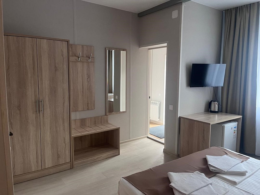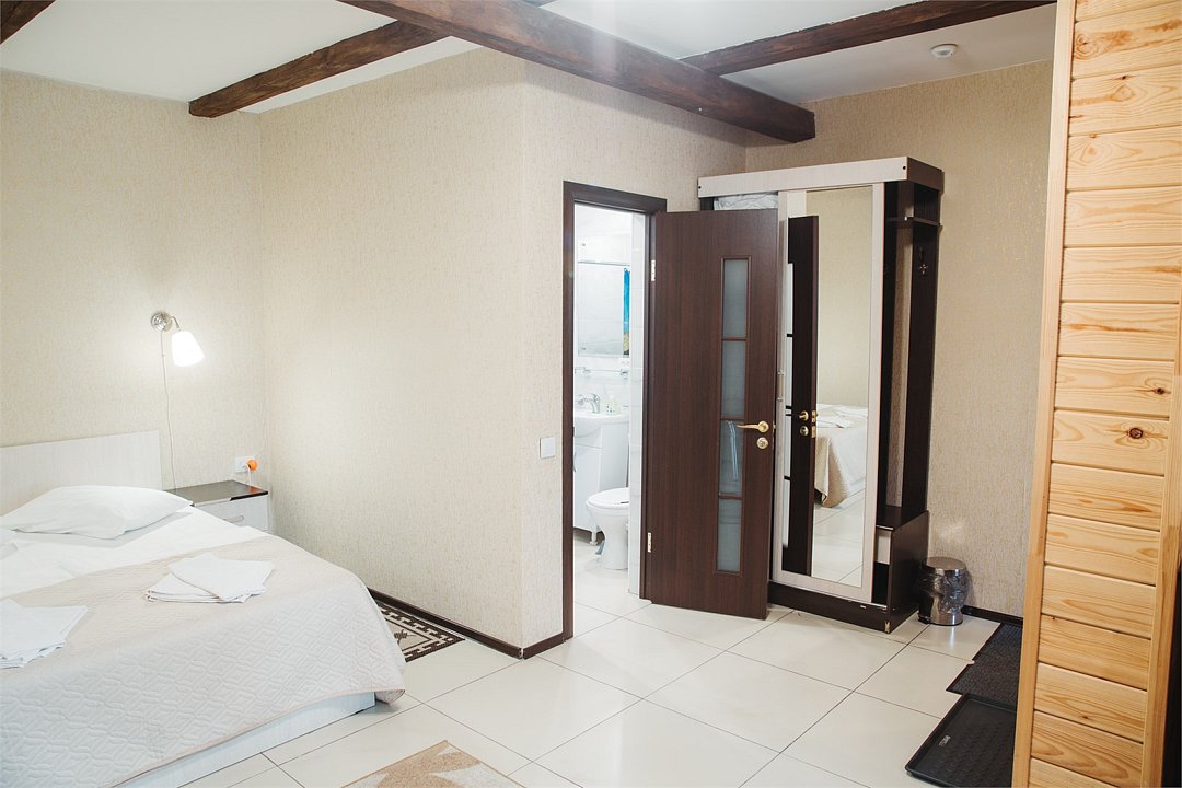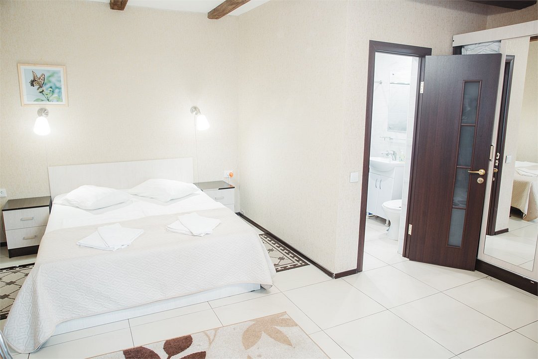 Однокомнатный двухместный номер с одной двухспальной кроватью. Площадь номера — 26 кв.м. В номере: прихожая, спальная комната, ванная комната с душевой кабиной, диван. Оснащение номера: фен, туалетные принадлежности, спутниковое TV, холодильник, ср-ва личной гигиены (гель/шампунь), посуда на 2 персоны (приборы/порционные тарелки, чайная пара, стаканы), двуспальная кровать, диван, кондиционер, халаты, тапочки одноразовые, бесплатный Wi-Fi в общественных местах. По запросу в номере устраивается на диване дополнительное место для одного взрослого или два детских места.Услуги и удобства