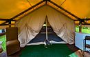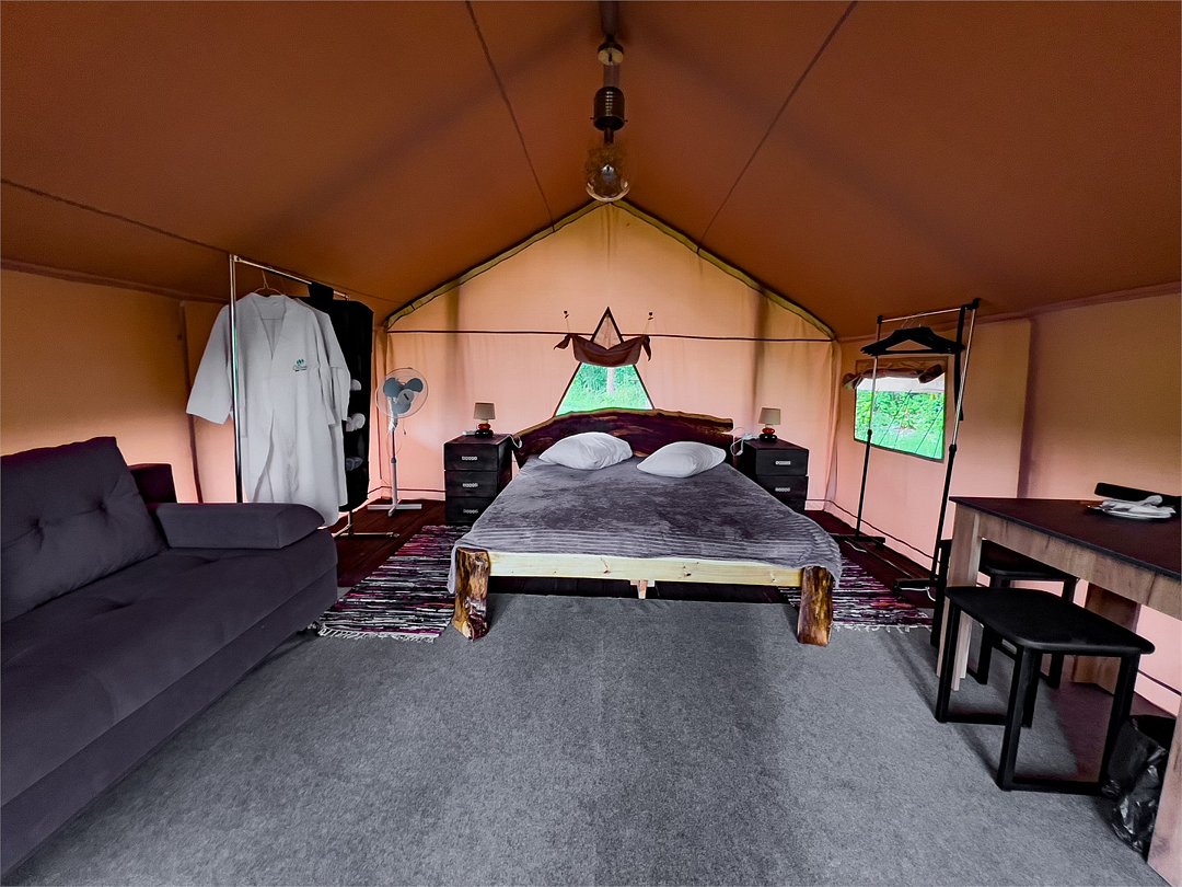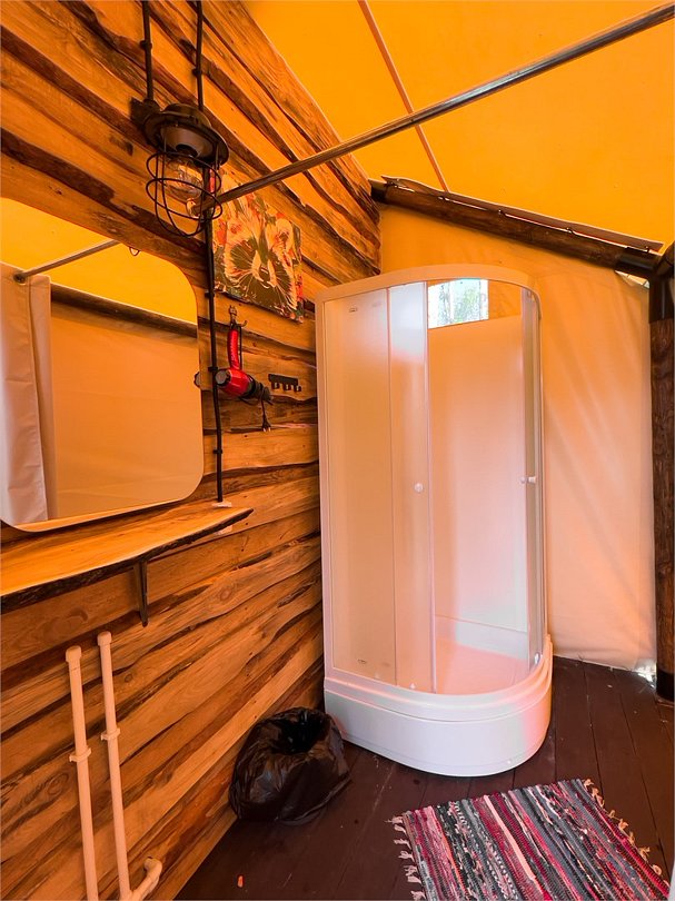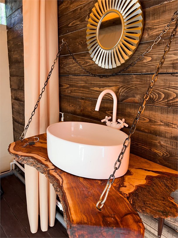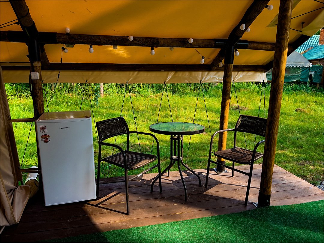 Однокомнатная двухместная глэмпинг с одной двуспальной кроватью и мангальной зоной + можем установить дополнительное спальное место (диван). Площадь глэмпинга — 28 кв. м. Оснащение: двуспальная кровать, диван, стол, 2 табуретки, электричество и осветительные приборы, рейл для одежды, а также большая лоджия включающая в себя 2 столика, 2 кресла, 2 стула. Удобства: кондиционер, вентилятор, мини-холодильник, полотенца, халаты, фен, эл. чайник, посуда на 2 персоны, бесплатный Wi-Fi. Туалет и душевая комната находятся сзади глэмпингов. Оснащение: фен, душевая кабина, зеркало, раковина. По запросу устанавливаем детскую кроватку.Услуги и удобства