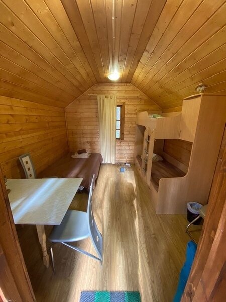 свежее постельное белье - двухспальная и одна односпальная кровати,стол, стулья, мини зона отдыха около домика