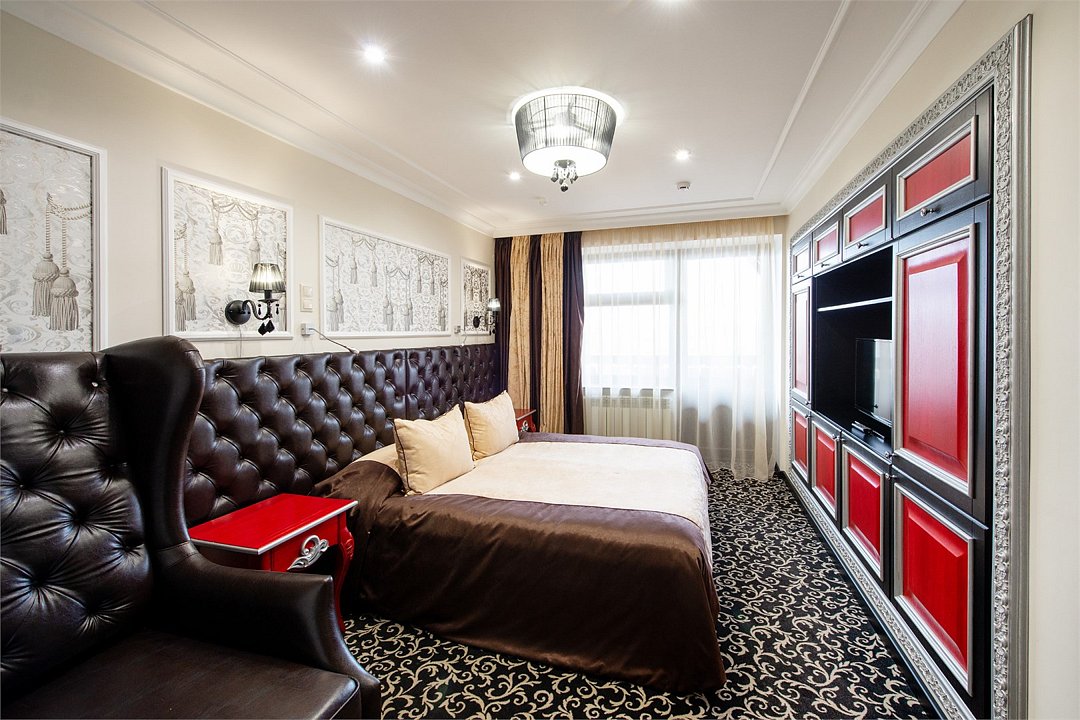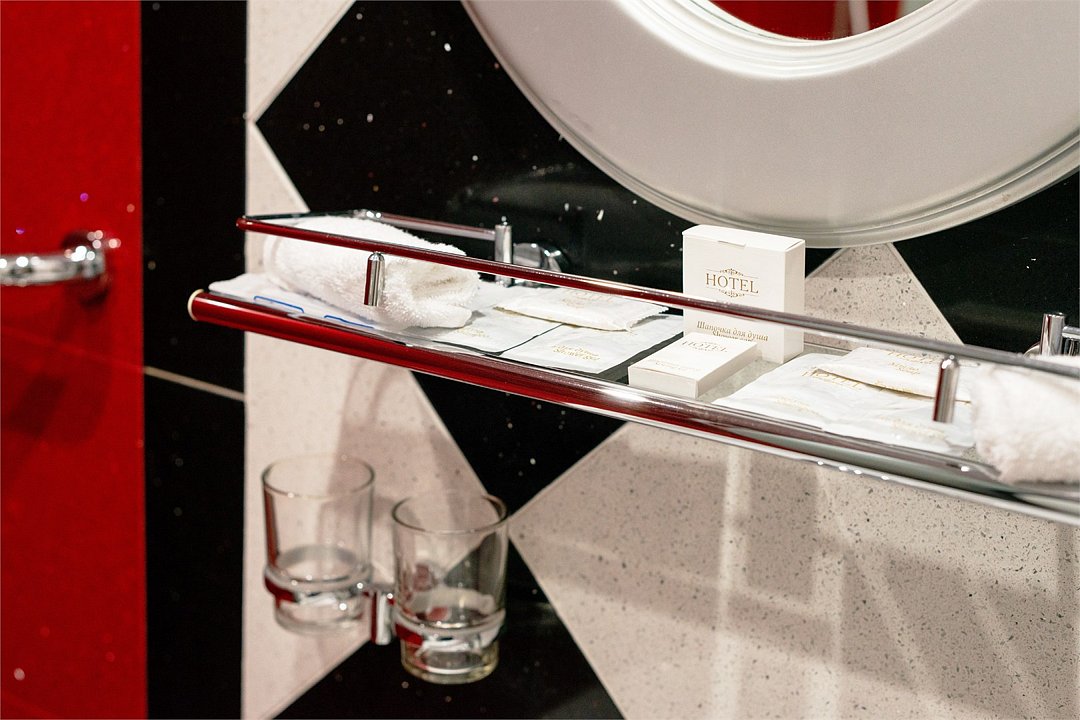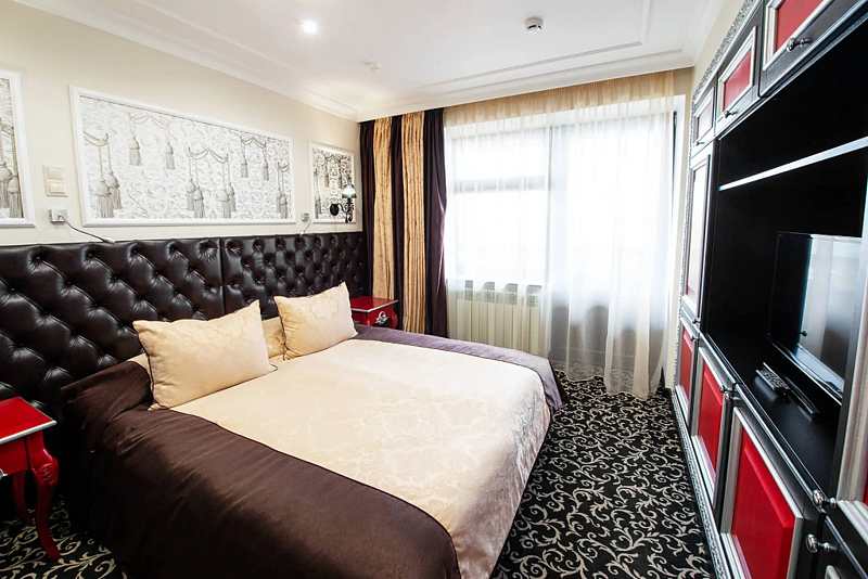 Wi-Fi, кондиционер, фен, электронные замки, душевая кабина, халаты, банные полотенца, тапочки, балкон, двуспальная кровать, тумбы, шкаф для одежды, зеркало, комод, пуфики, раковина, ковровое покрытие, вид на город, кулер на этаже, стаканы, туалетный столик, внутренний телефон, телевизор с плоским экраном, мини-холодильник, гостиничная парфюмерия, номер для некурящихВ гостиничном номере