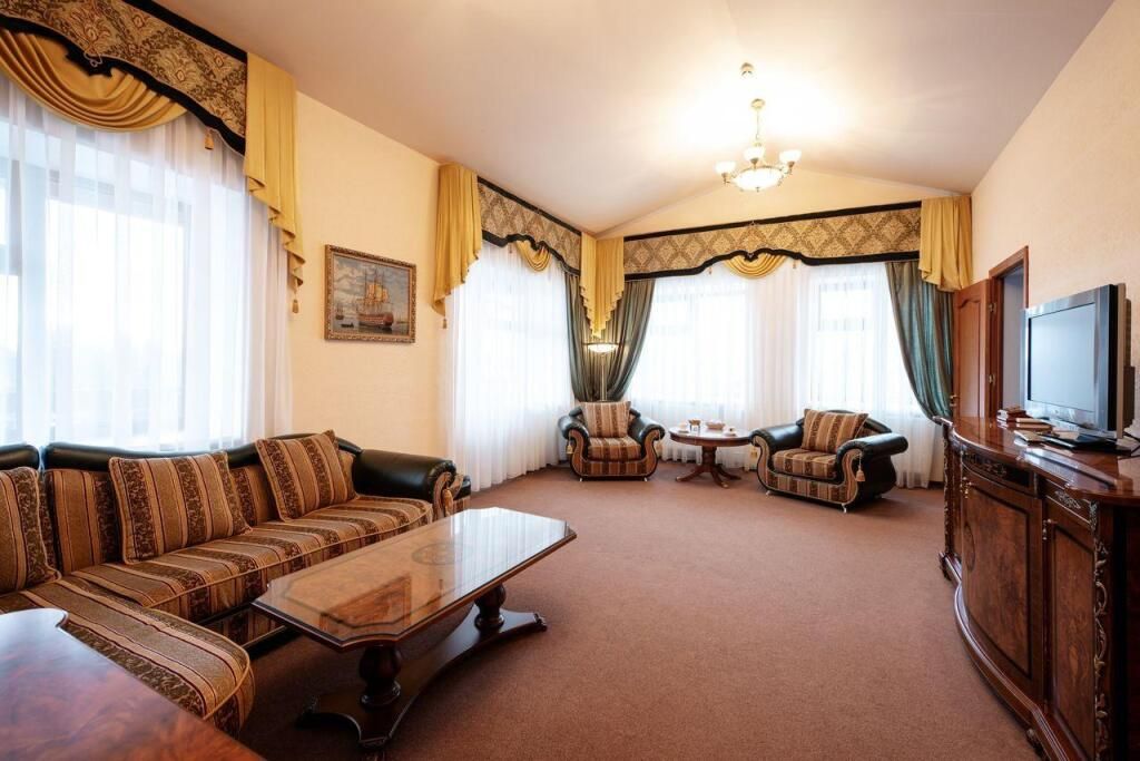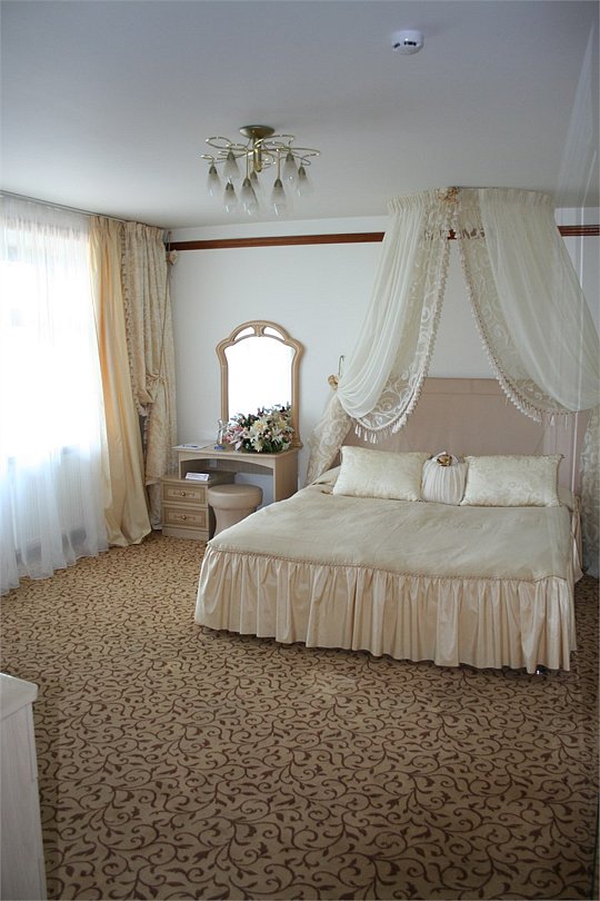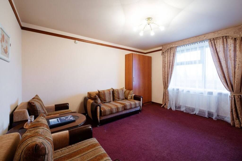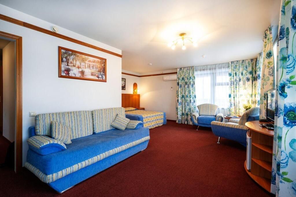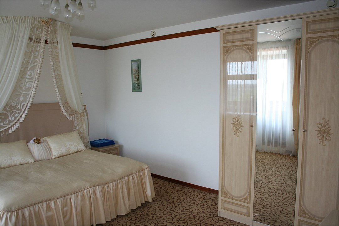 Для проживания двух - шести человек. Номер площадью - 60 кв.м - в номере 3 комнаты: в одной - двуспальная кровать, туалетный столик с зеркалом, 2 тумбочки, пуфик. Во второй комнате -двуспальная кровать, туалетный столик с зеркалом, 2 тумбочки, пуфик. В третьей - угловой диван, раскладывается на двух человек, журнальный столик, телевизор,телефон, панорамный балкон. Ванная комната с душевой кабиной, фен, туалетные принадлежности.Услуги и удобства