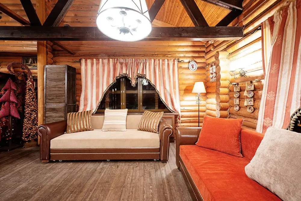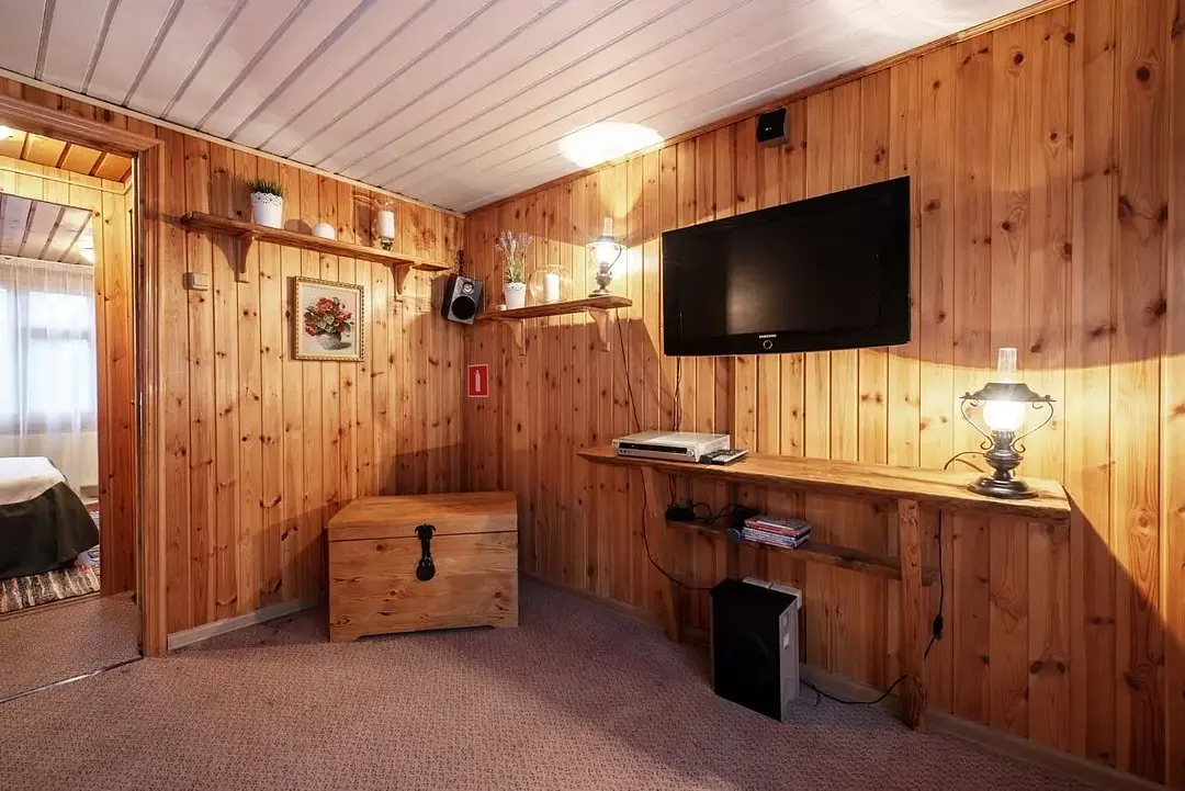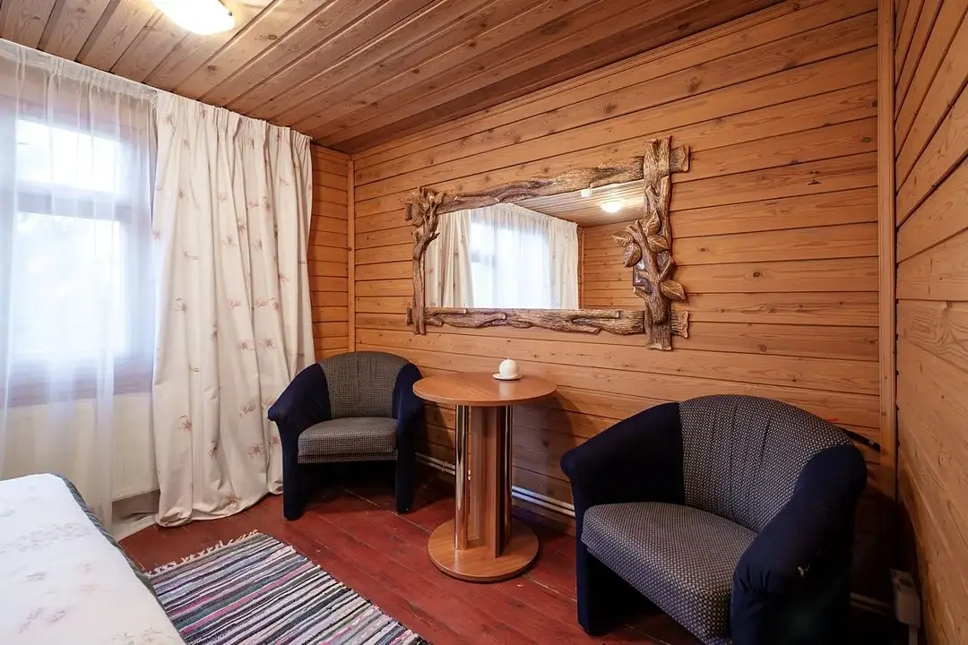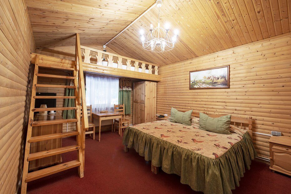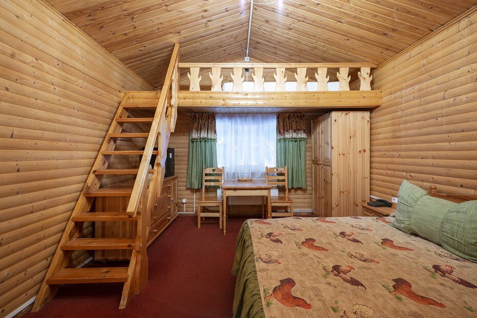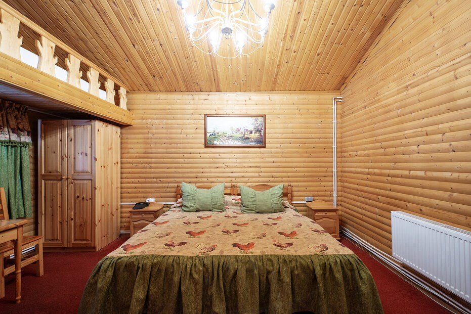 Русский домик - однокомнатный деревянный домик площадью 25 кв.м. для комфортного размещения двух-четырех человек. В домике расположены две полутороспальные кровати, дополниительное место на палатях. Возможна установка детской кроватки или евро-раскладушки. *изображение на сайте носит информационный характер, может не соответствовать предоставляемому номеру в отдельных элементах интерьера или цветовой гаммеУслуги и удобства