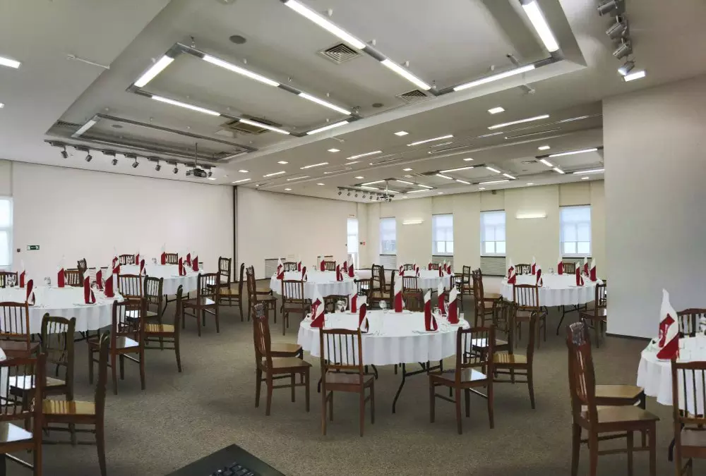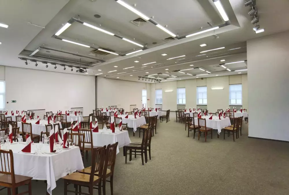 Многообразие вариантов банкетных рассадок и фуршетных зон, профессиональное музыкальное и световое оборудование для проведения мероприятий любого уровня, а профессиональная команда поваров воплотит в жизнь самые изысканные пожелания и наполнит праздник вкусом. Гостям предлагаются современные конференц-залы, способные вместить до 300 человек, а на втором этаже бизнес-центра расположен зал-трансформер на 220 мест, готовый адаптироваться под любые потребности.