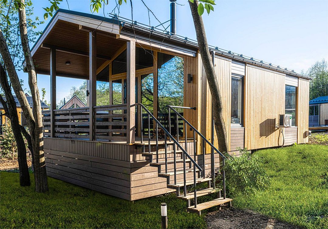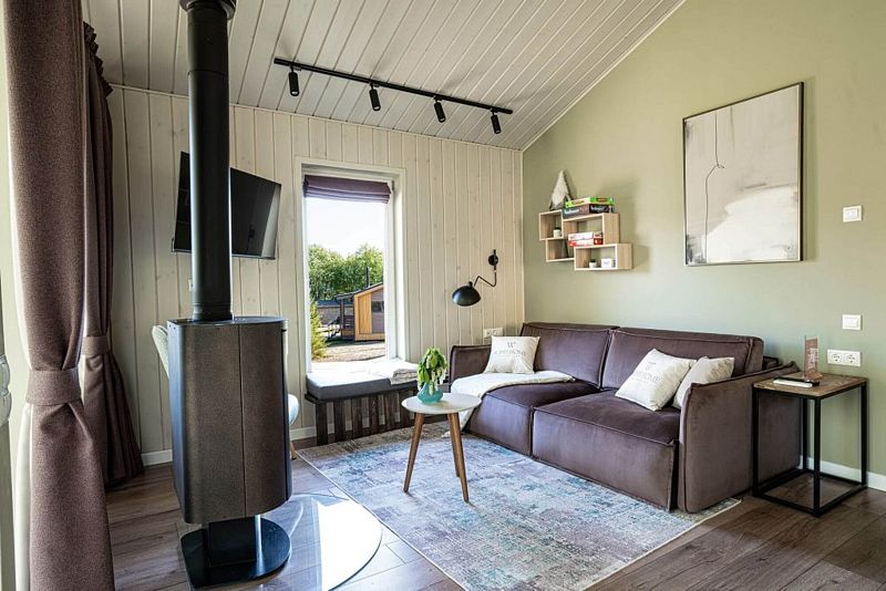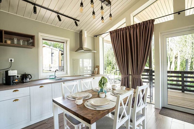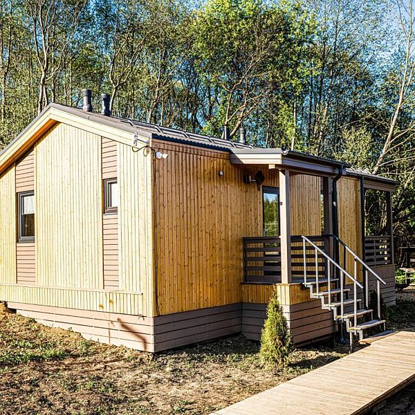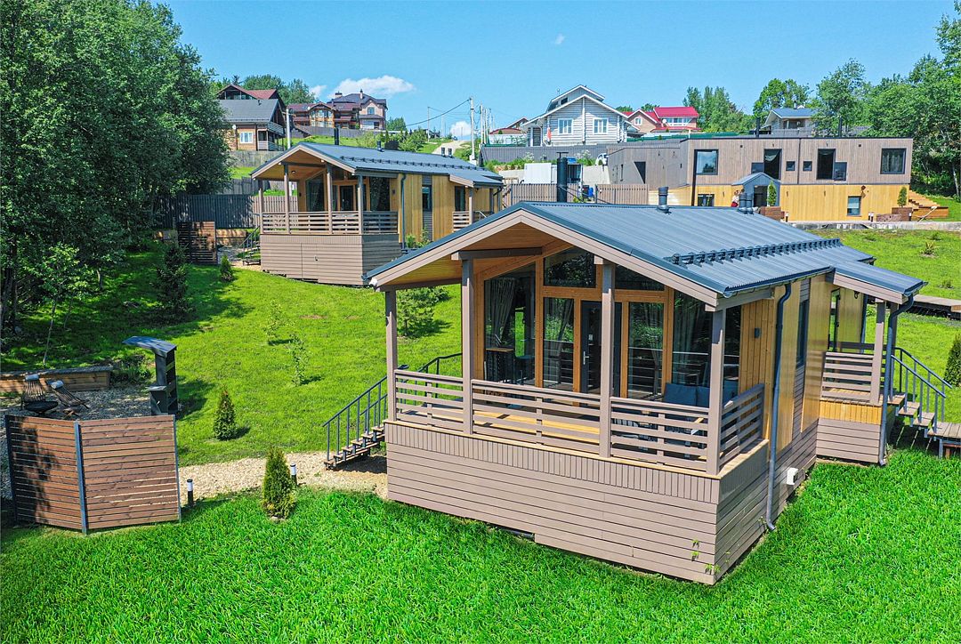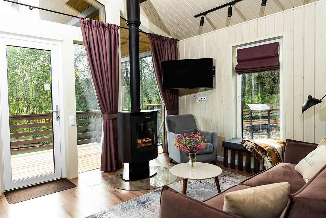 На благоустроенной охраняемой территории вас ждут уединенные домики – эко-лоджи. Светлые и уютные, с террасой и панорамными окнами, они оборудованы всем необходимым для комфортного отдыха: кухней, гостиной с камином и санузлом (с ванной или душевой кабиной).