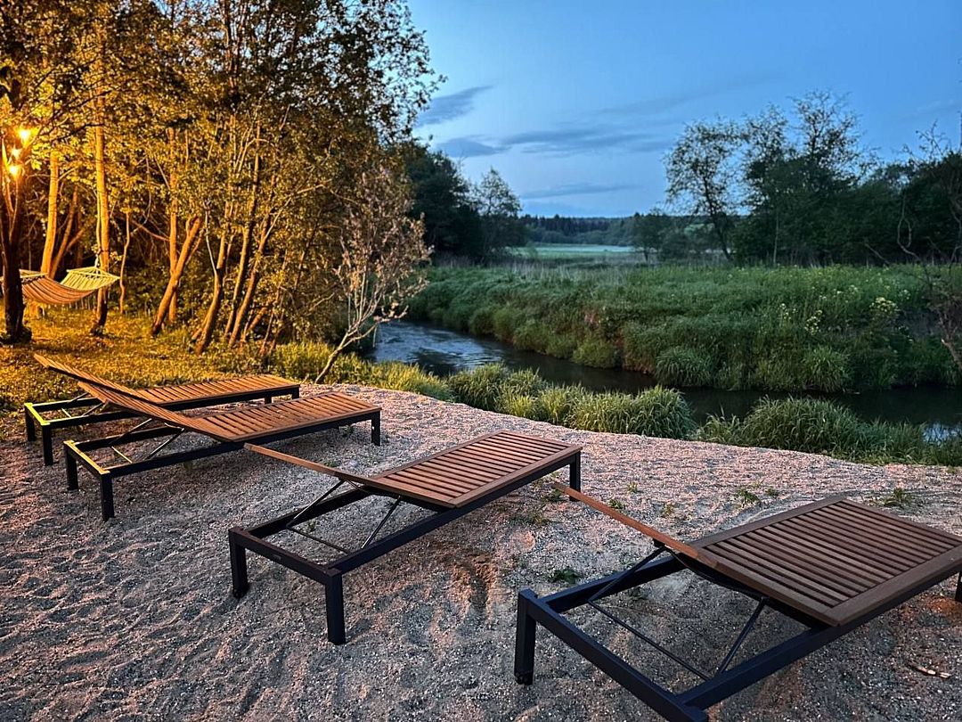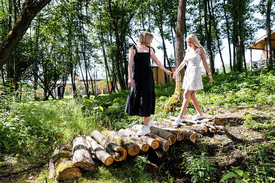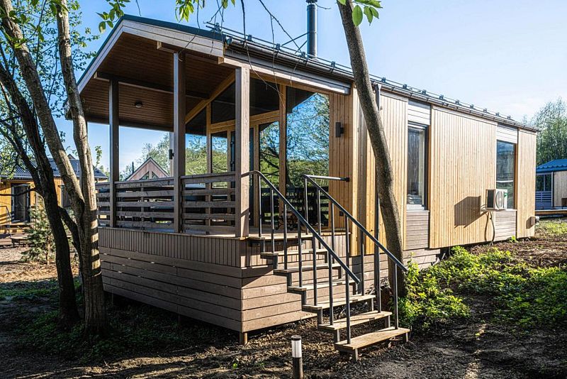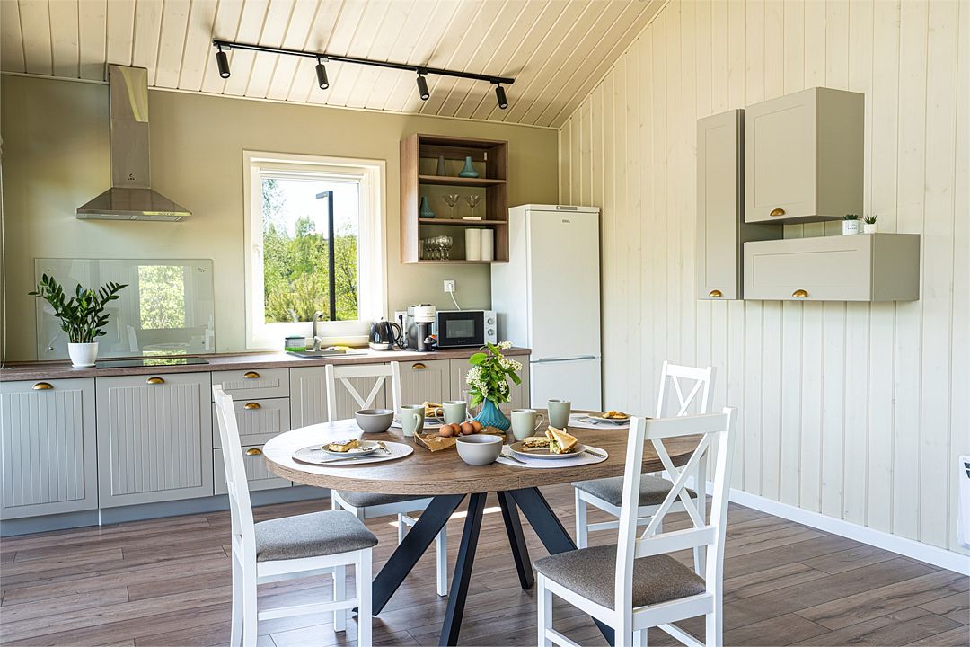 На благоустроенной охраняемой территории вас ждут уединенные домики – эко-лоджи. Светлые и уютные, с террасой и панорамными окнами, они оборудованы всем необходимым для комфортного отдыха: кухней, гостиной с камином и санузлом (с ванной или душевой кабиной).