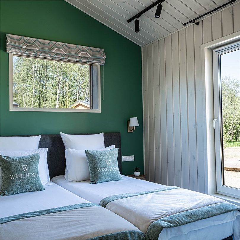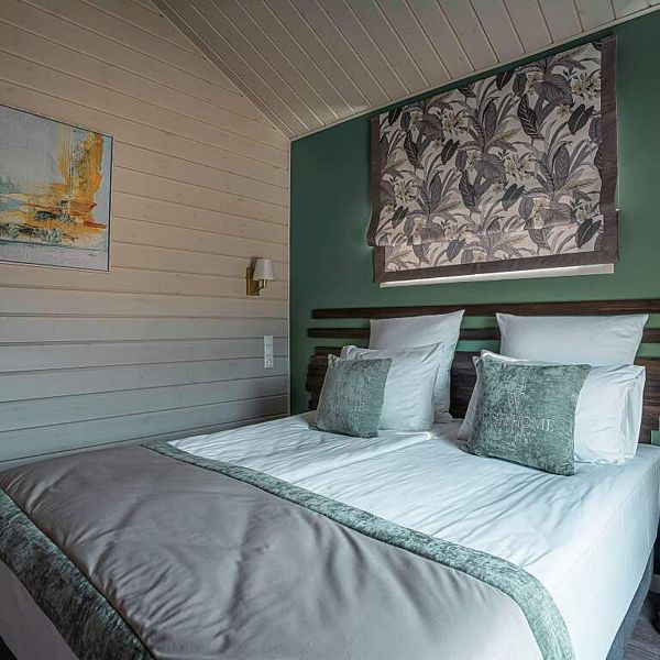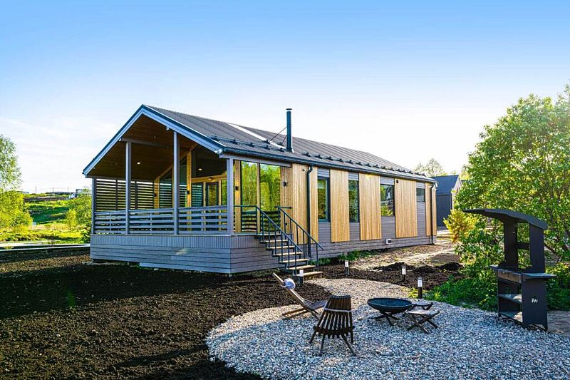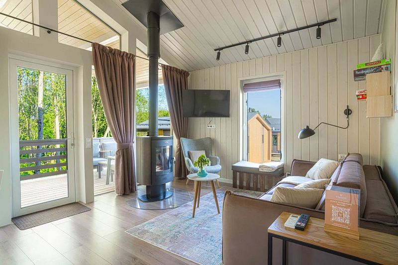 Просторный лодж с панорамными окнами, увеличенной меблированной террасой, гостиной и двумя спальнями – для компании или незабываемого семейного отдыха с детьми.
