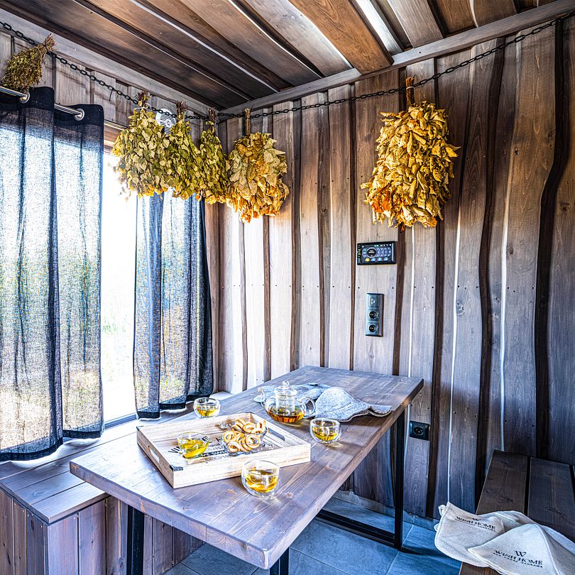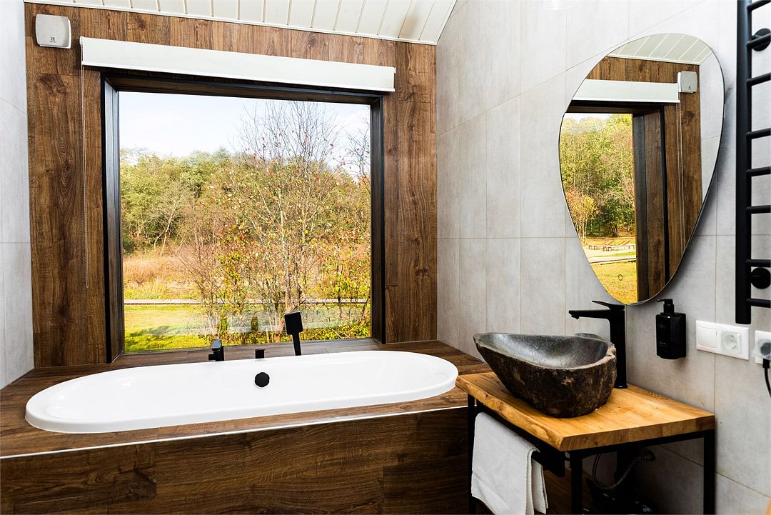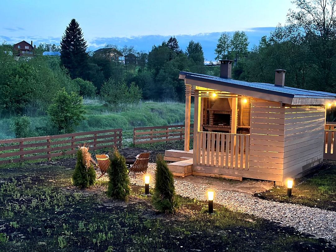 К вашим услугам беседка с панорамными окнами, зона для барбекю, а также баня с купелью, где можно расслабиться после насыщенного дня. Дополнительные удобства: безлимитный интернет и детская площадка.
