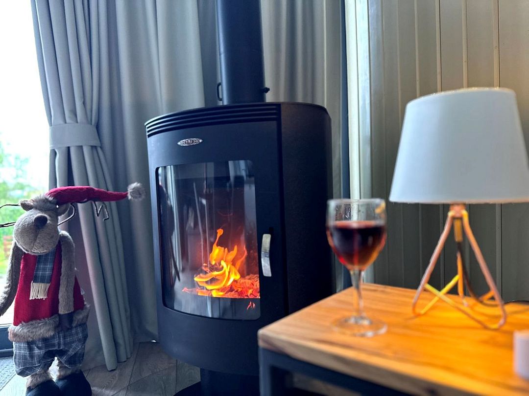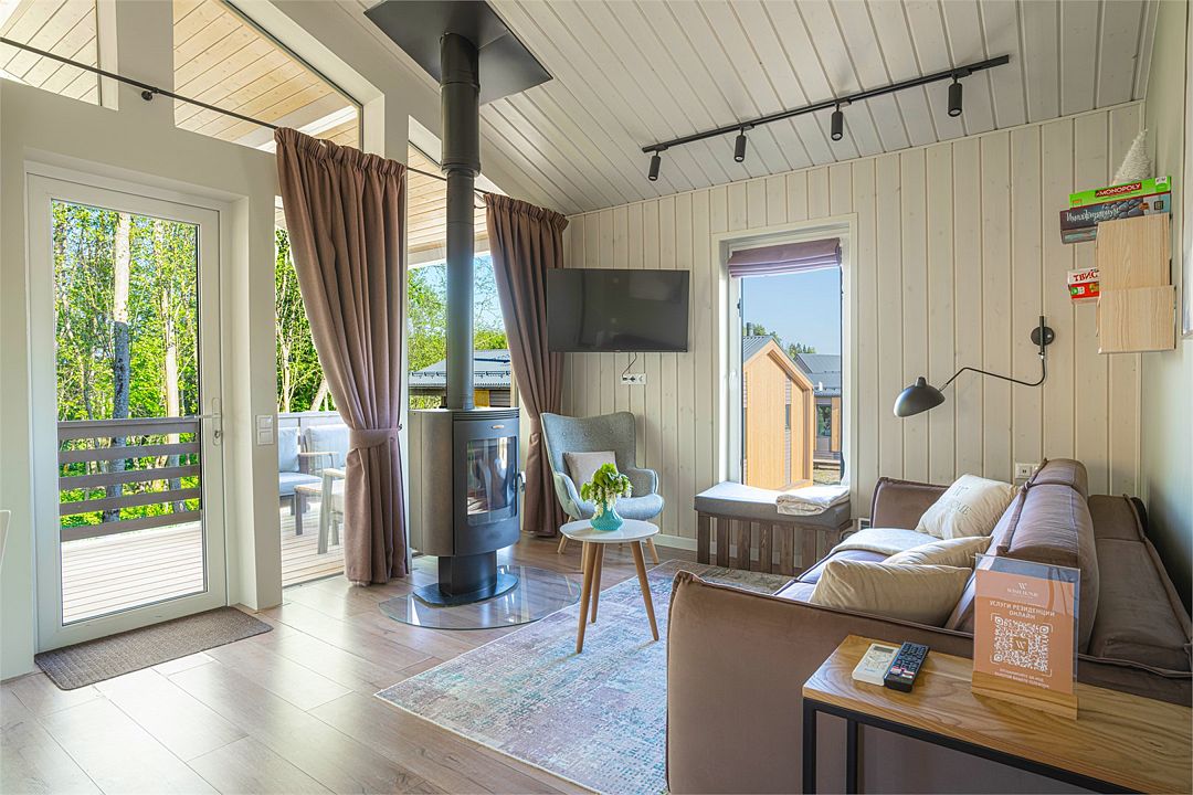 Лоджи №2, 3, 4, 13, 14. Спальня с двухместной кроватью и удобным ортопедическим матрасом, гостиная и комфортная ванная, терраса и мангальная зона. Интерьер выполнен в скандинавском стиле с использованием экологичных материалов, натуральных фактур, во всех комнатах обустроены теплые полы. В гостиной – дровяной камин с зоной отдыха и обеденная зона с функциональной кухнейУслуги и удобства