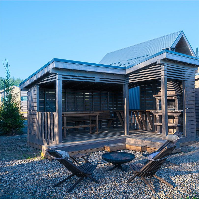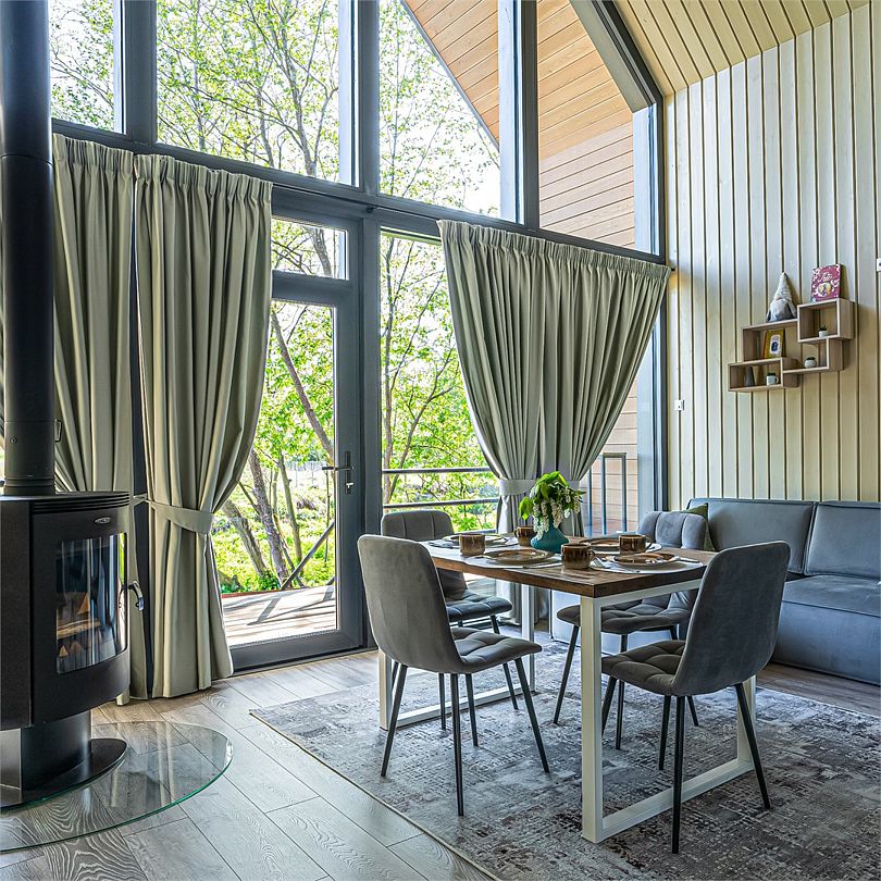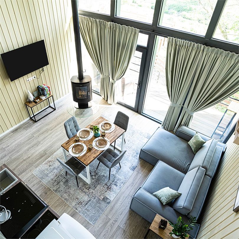Просторный двухэтажный лодж с панорамными окнами, двумя спальнями, гостиной и собственной беседкой с костровой зоной BBQ – идеально для двоих, семейного отдыха и компании друзей из четырех человек.