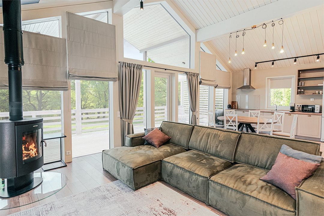 В гостиной – дровяной камин с зоной отдыха и обеденная зона с функциональной кухней, оснащенной всем необходимым для приготовления семейного обеда или романтического ужина.