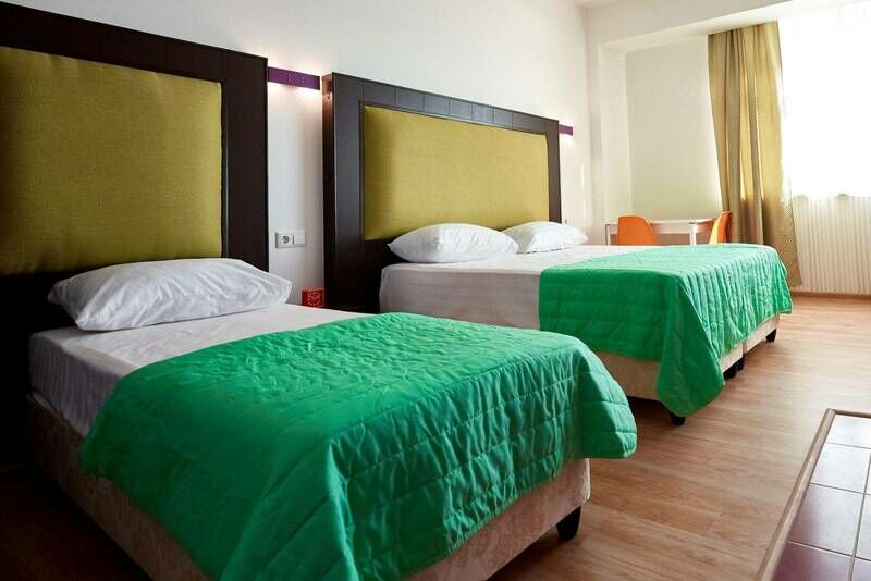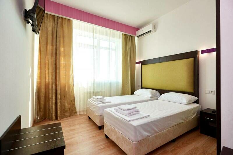 2 односпальные кровати, тумбочки, шкаф для одежды, вешалка, зеркало, письменный стол, холодильник, тв, душ, фен, сплит-система, возможно доп. место