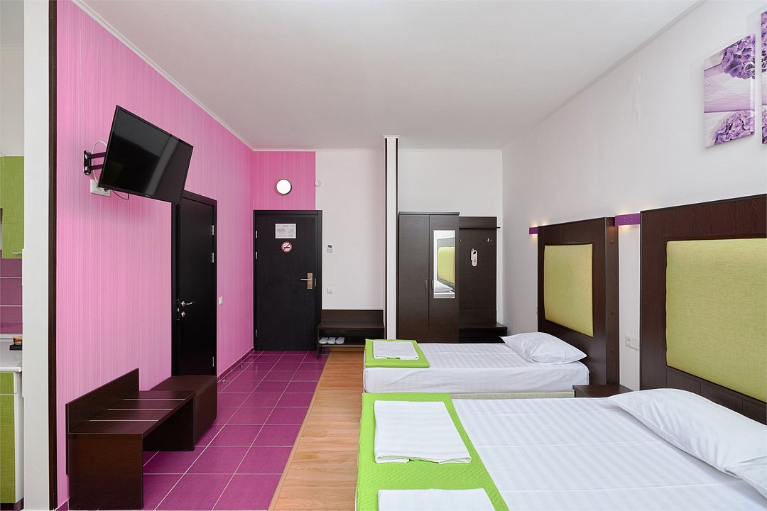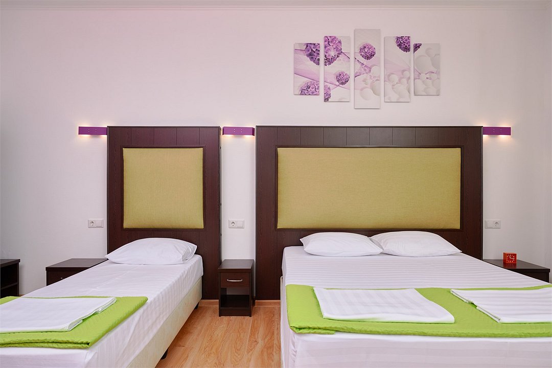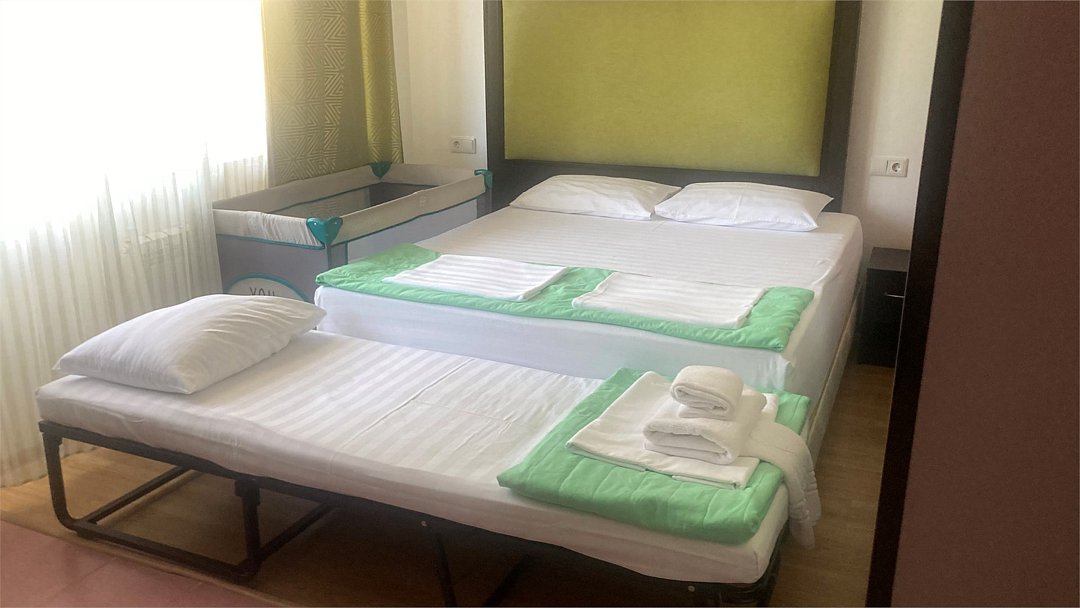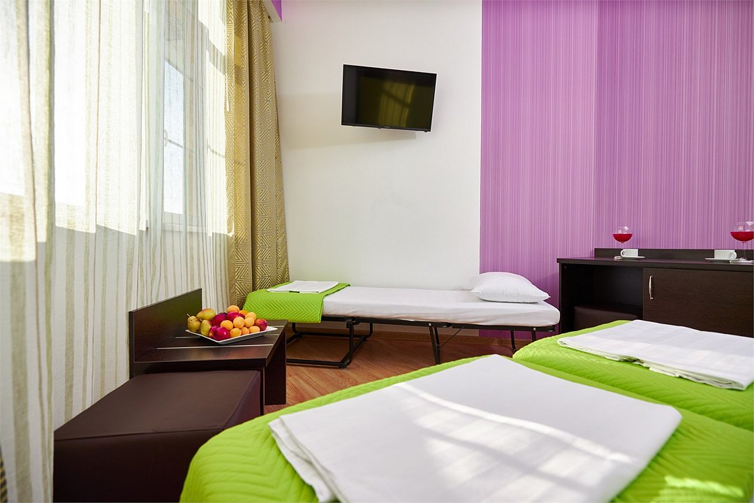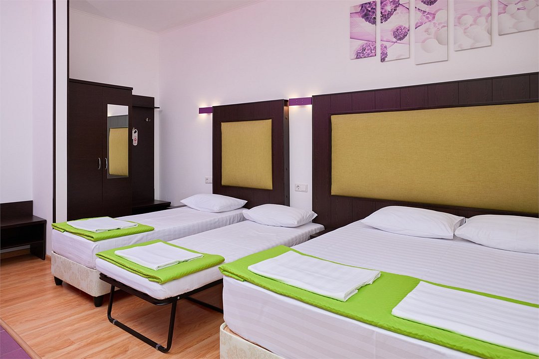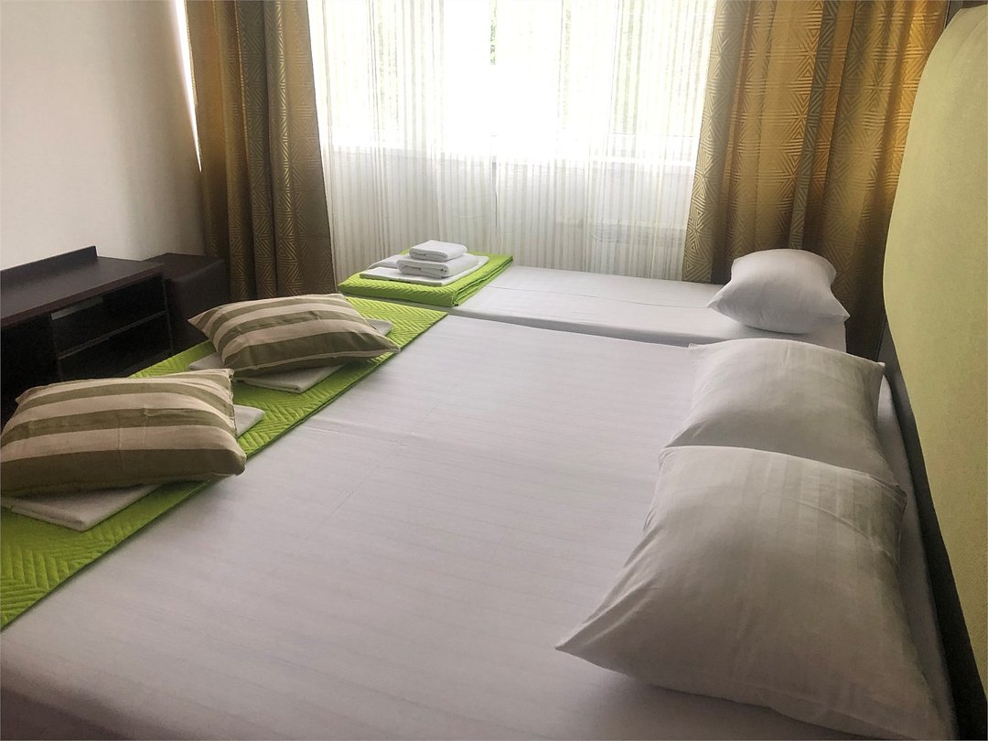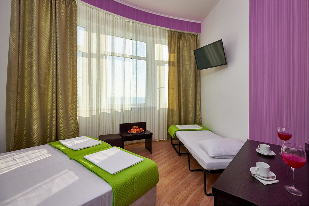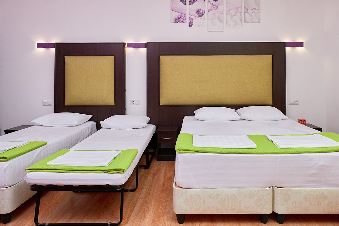 3-х местный номер Эконом без балкона подойдет для бюджетного размещения 3-4 человек оборудован кухонным уголком с обеденным столом, столовой посудой и эл.чайником. Для размещения 4го гостя в номере есть пуф, трансформирующийся в полноценную дополнительную кровать. Возможно размещение ребенка 3-6 лет на кровати с родителями или люля для ребенка 0-3 года.Услуги и удобства