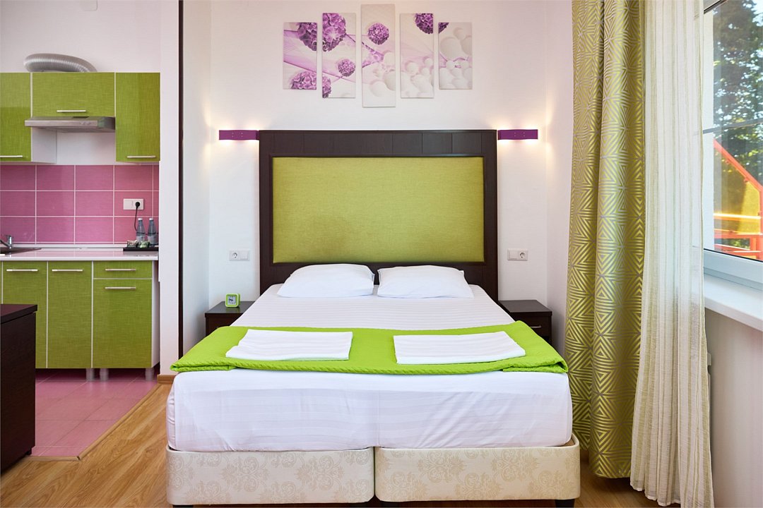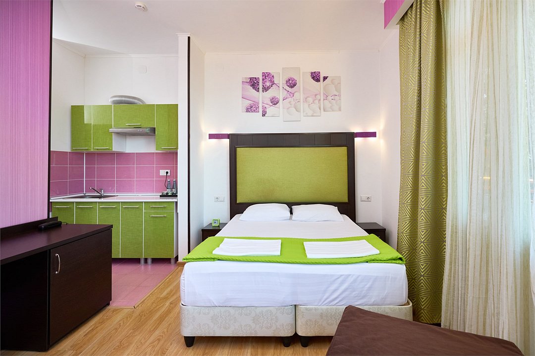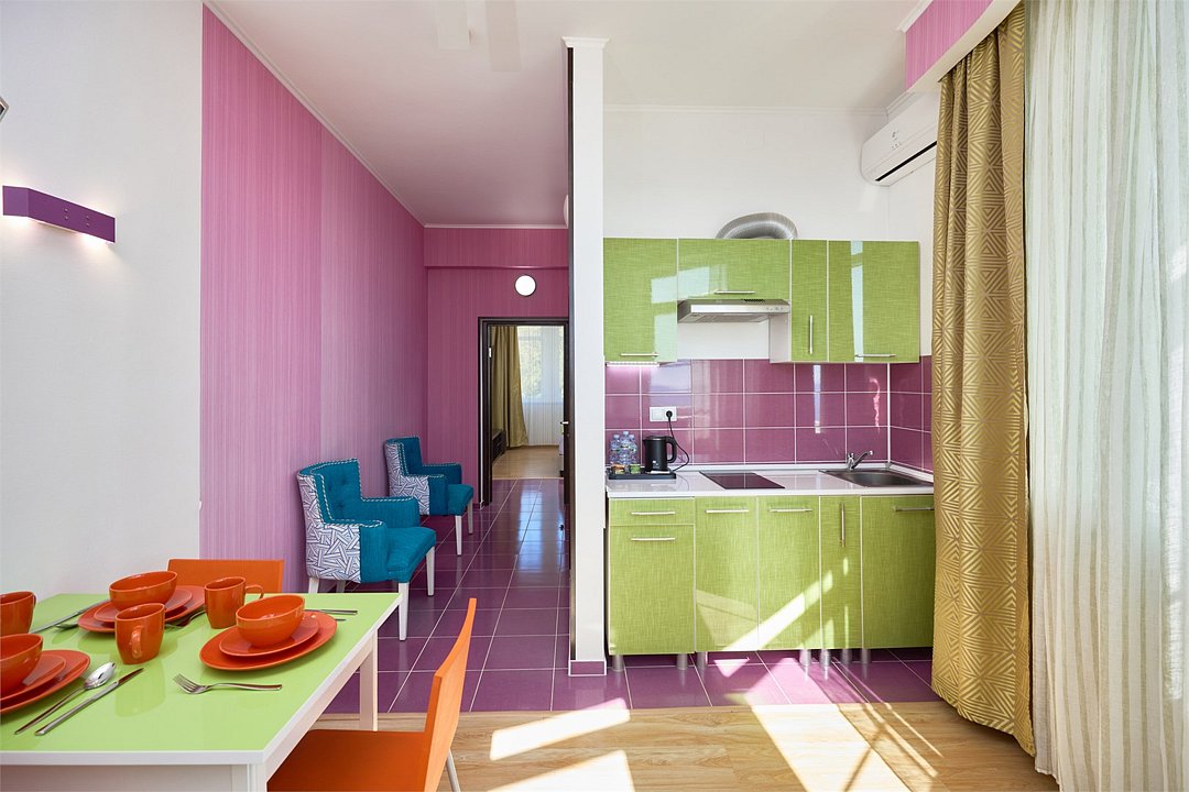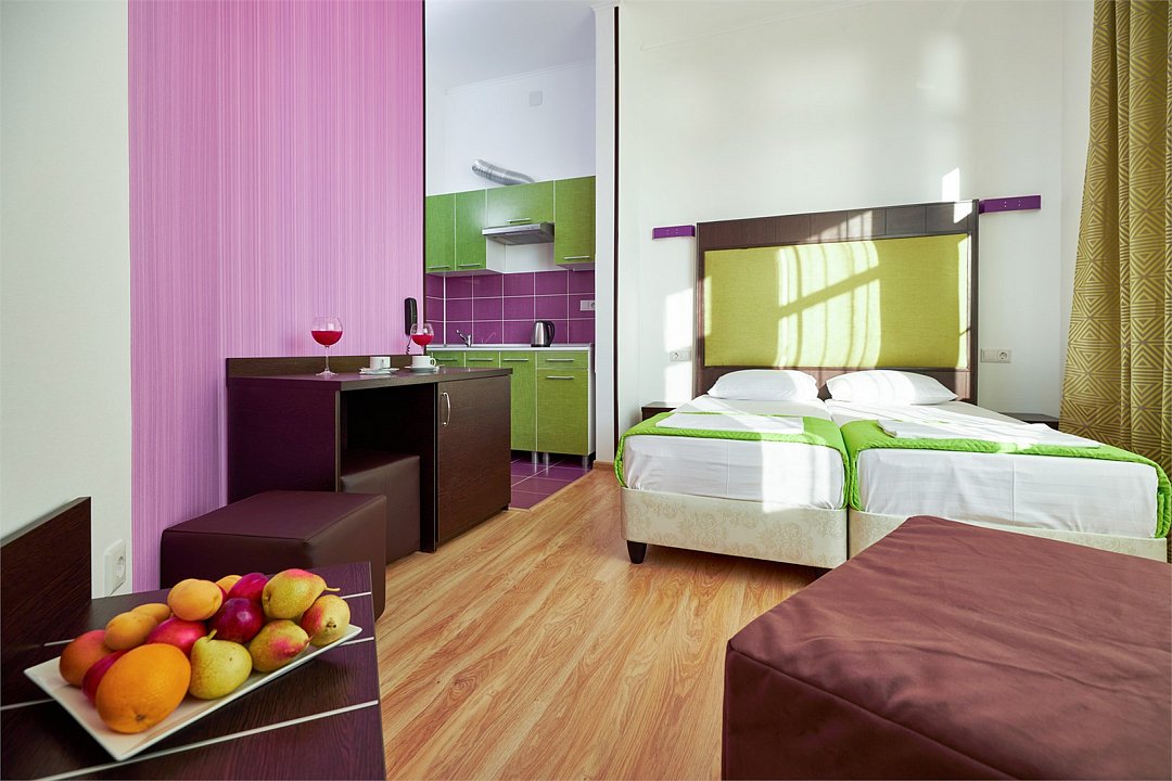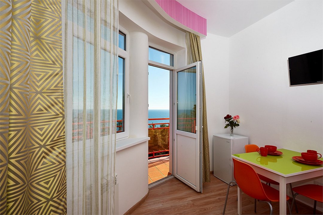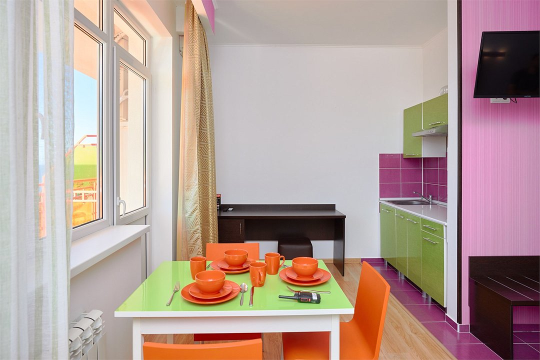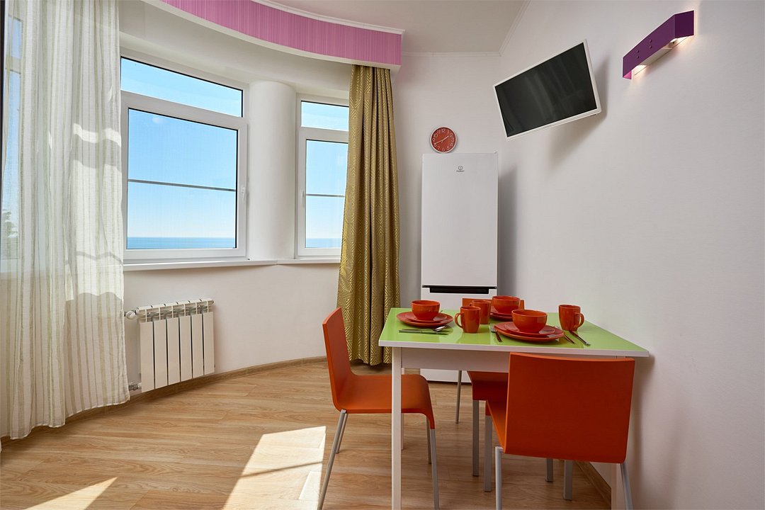 Просторный номер с гостиной зоной, оборудованной кухонной мебелью, посудой, потолочным вентилятором, вытяжкой, холодильником и телевизором с плоским экраном. на балконе номера, оборудованном садовой мебелью. Гостям доступна премиум линейка парфюмерии, банные халаты. В спальне гости могут воспользоваться большим Смарт ТВ с плоским экраном и доступом в интернет. В номере могут разместится 2-4 гостя. Для размещения 3го и 4го гостя в номере есть пуфы, трансформирующийся в полноценную дополнительную кровать. Возможно размещение ребенка 3-6 лет на кровати с родителями или люля для ребенка 0-3 года.Услуги и удобства