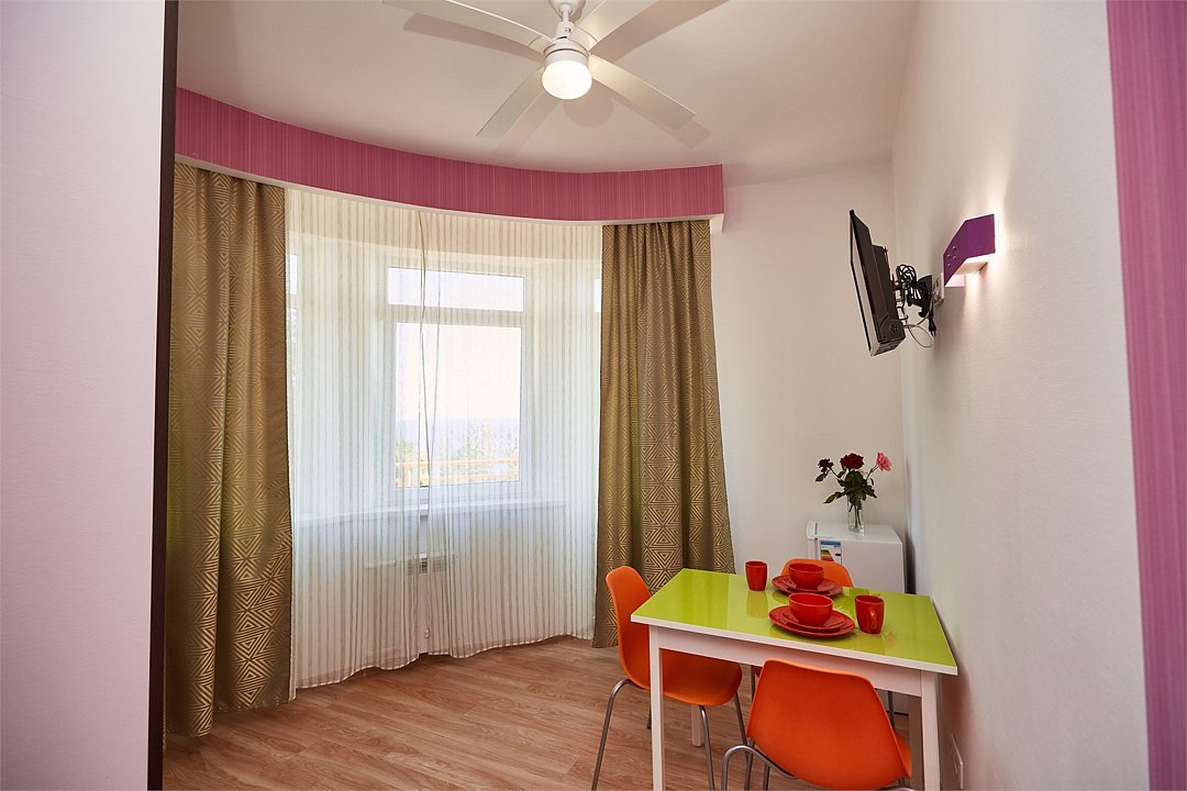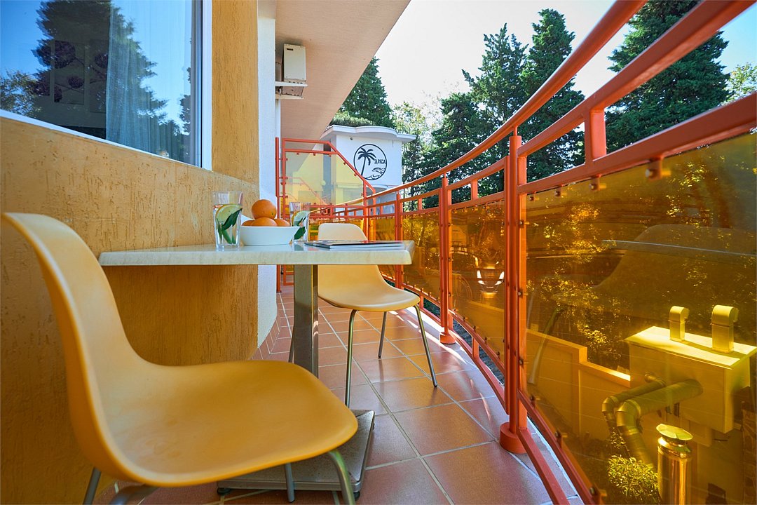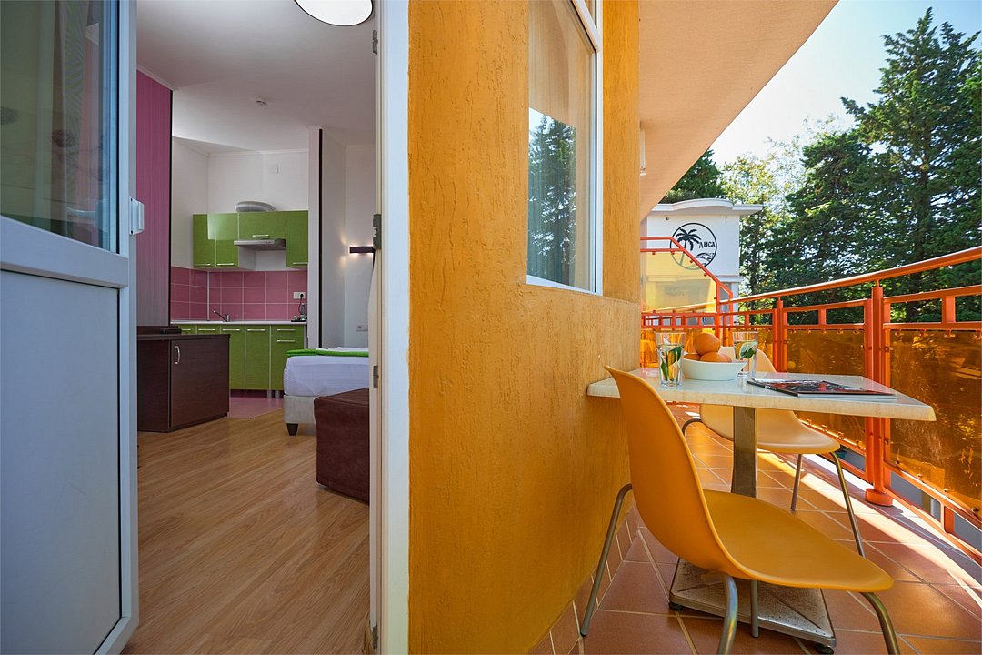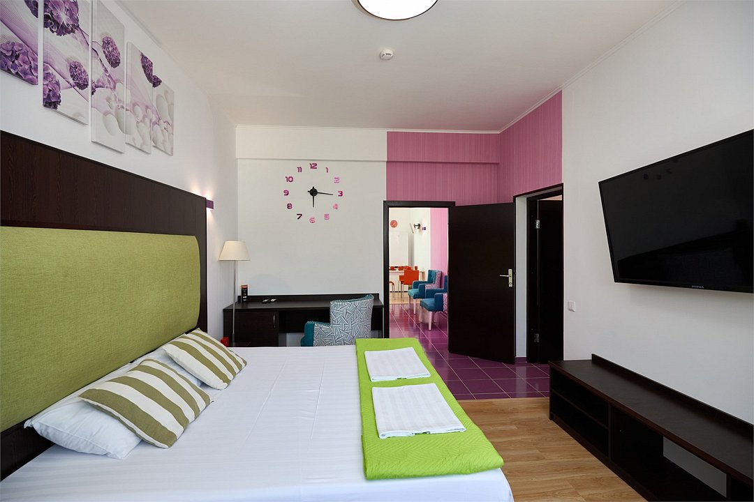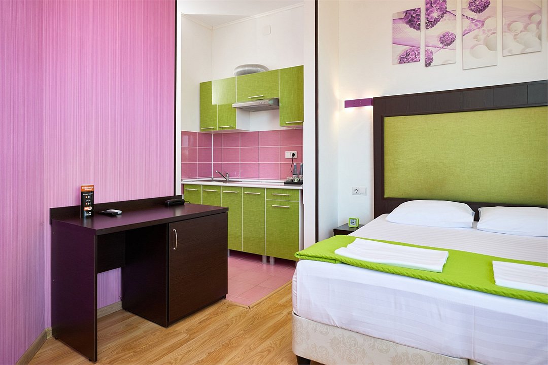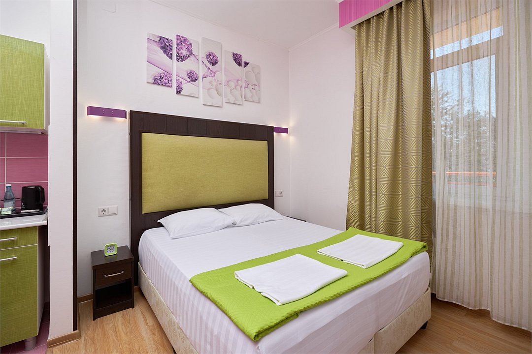 Просторный номер с гостиной зоной, оборудованной кухонной мебелью, посудой, потолочным вентилятором, вытяжкой, холодильником и телевизором с плоским экраном. на балконе номера, оборудованном садовой мебелью. Гостям доступна премиум линейка парфюмерии, банные халаты. В спальне гости могут воспользоваться большим Смарт ТВ с плоским экраном и доступом в интернет. В номере могут разместится 2-4 гостя. Для размещения 3го и 4го гостя в номере есть пуфы, трансформирующийся в полноценную дополнительную кровать. Возможно размещение ребенка 3-6 лет на кровати с родителями или люля для ребенка 0-3 года.Услуги и удобства