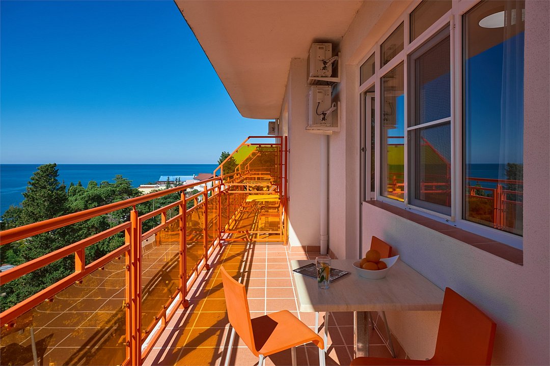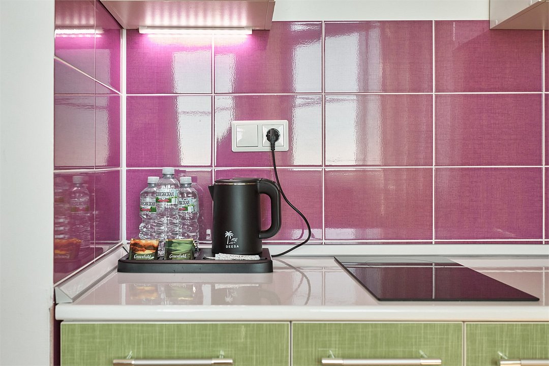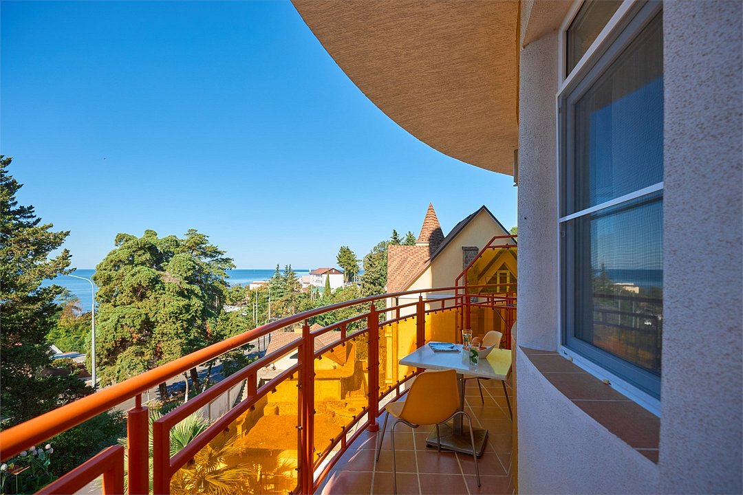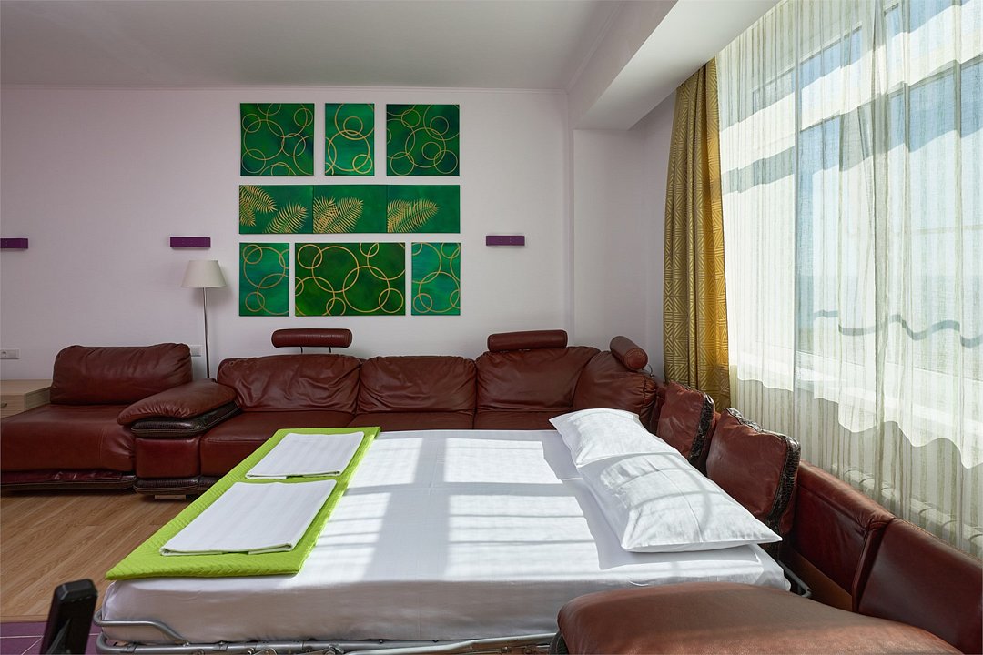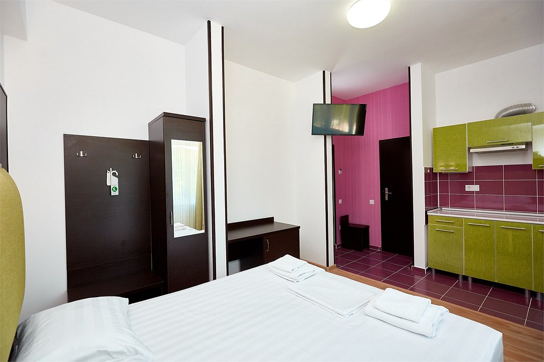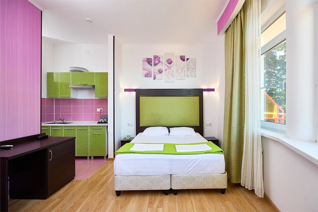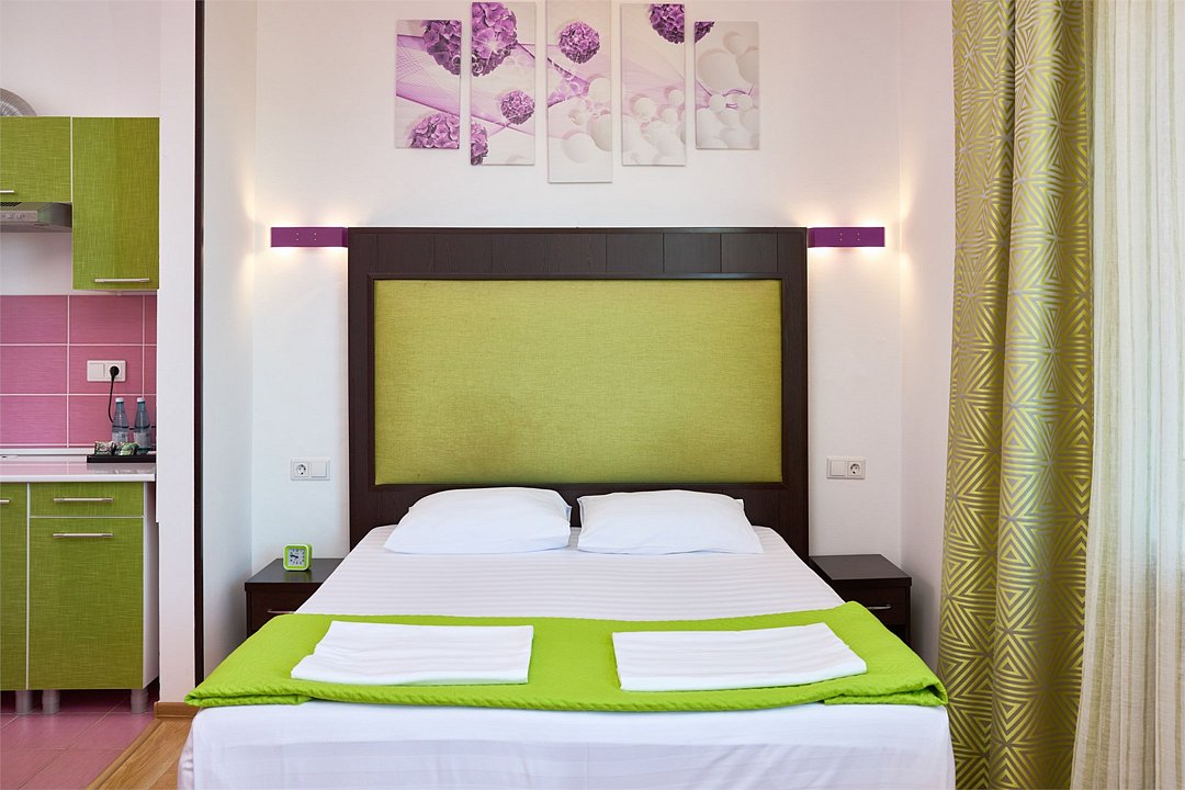 Просторный номер с гостиной зоной, оборудованной кухонной мебелью, посудой, потолочным вентилятором, вытяжкой, холодильником и телевизором с плоским экраном. на балконе номера, оборудованном садовой мебелью. Гостям доступна премиум линейка парфюмерии, банные халаты. В спальне гости могут воспользоваться большим Смарт ТВ с плоским экраном и доступом в интернет. В номере могут разместится 2-4 гостя. Для размещения 3го и 4го гостя в номере есть пуфы, трансформирующийся в полноценную дополнительную кровать. Возможно размещение ребенка 3-6 лет на кровати с родителями или люля для ребенка 0-3 года.Услуги и удобства