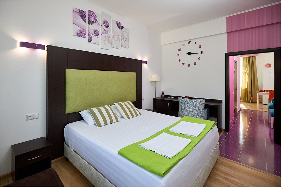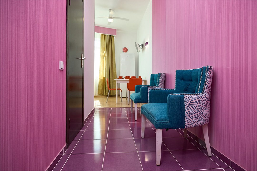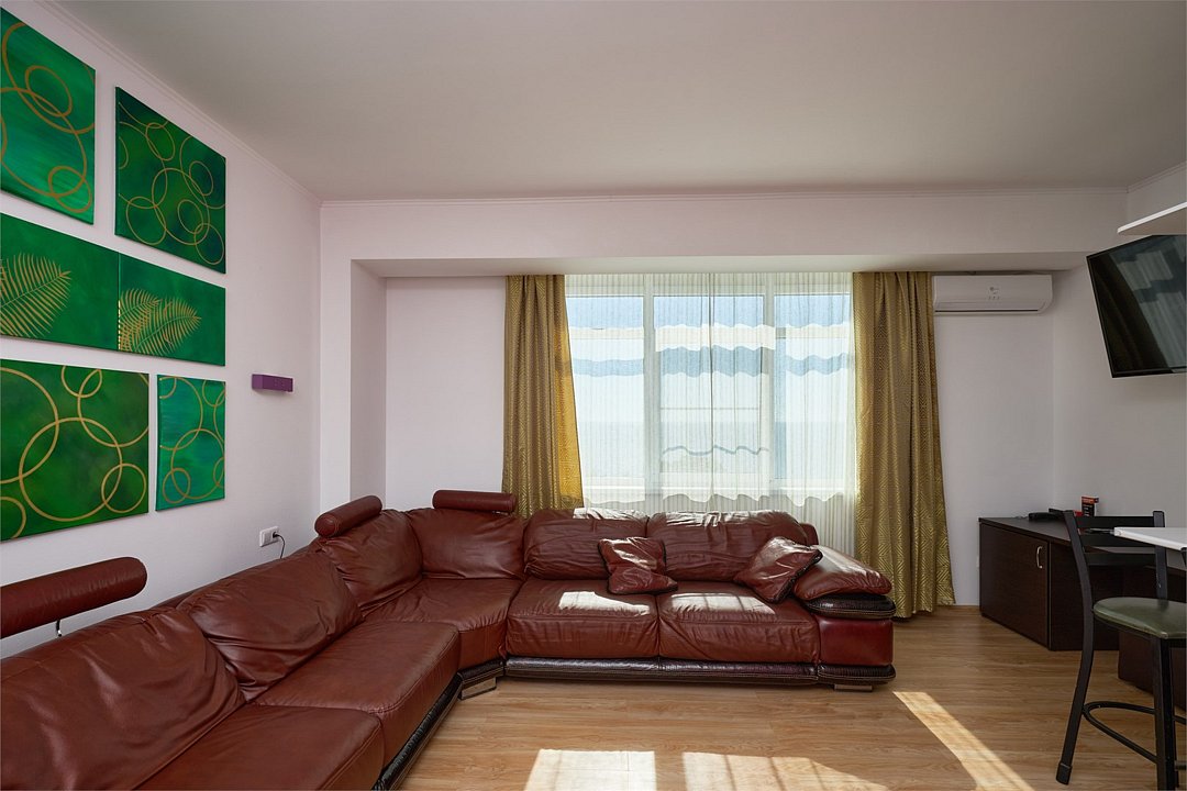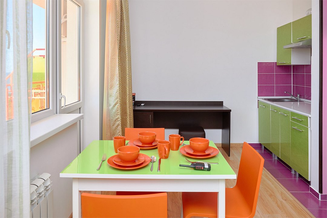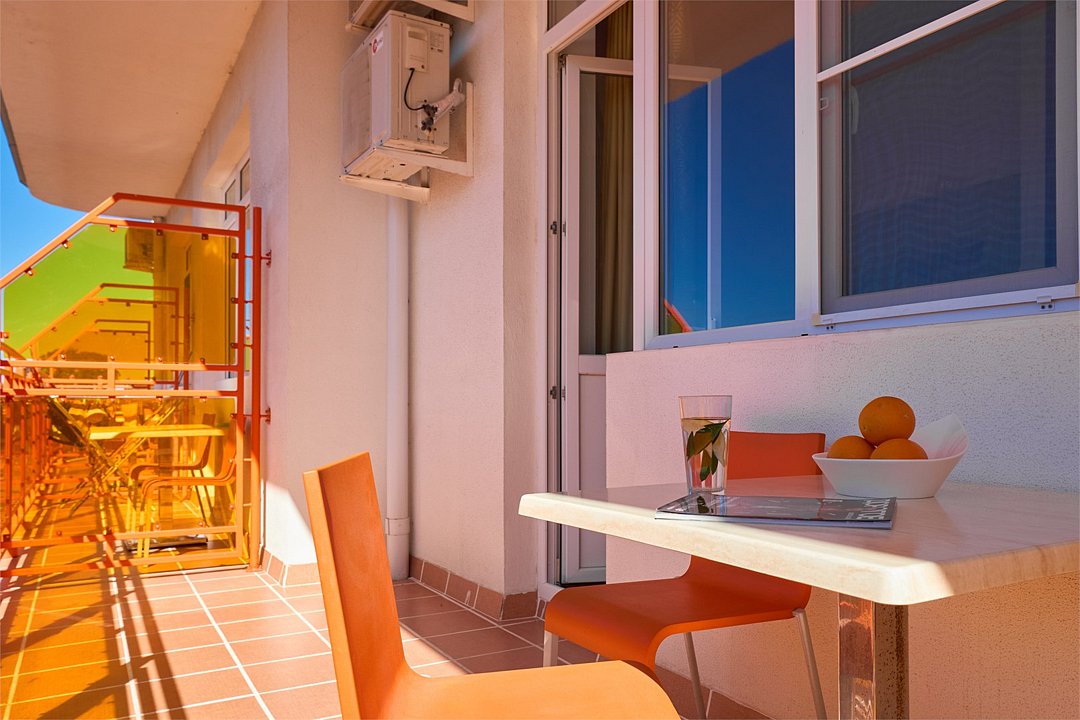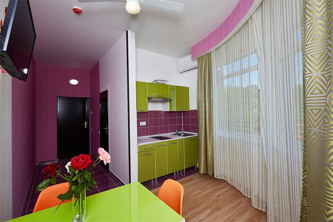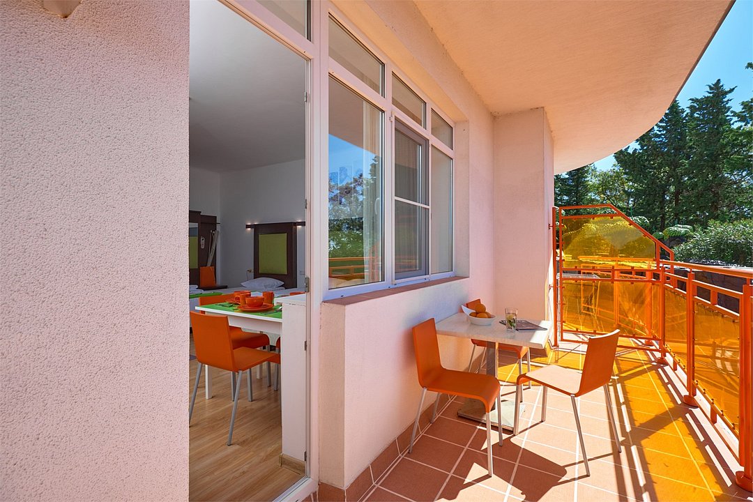 Просторный номер с гостиной зоной, оборудованной кухонной мебелью, посудой, потолочным вентилятором, вытяжкой, холодильником и телевизором с плоским экраном. на балконе номера, оборудованном садовой мебелью. Гостям доступна премиум линейка парфюмерии, банные халаты. В спальне гости могут воспользоваться большим Смарт ТВ с плоским экраном и доступом в интернет. В номере могут разместится 2-4 гостя. Для размещения 3го и 4го гостя в номере есть пуфы, трансформирующийся в полноценную дополнительную кровать. Возможно размещение ребенка 3-6 лет на кровати с родителями или люля для ребенка 0-3 года.Услуги и удобства