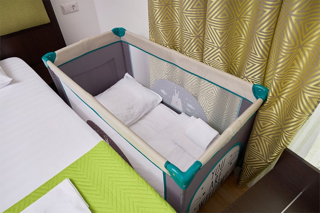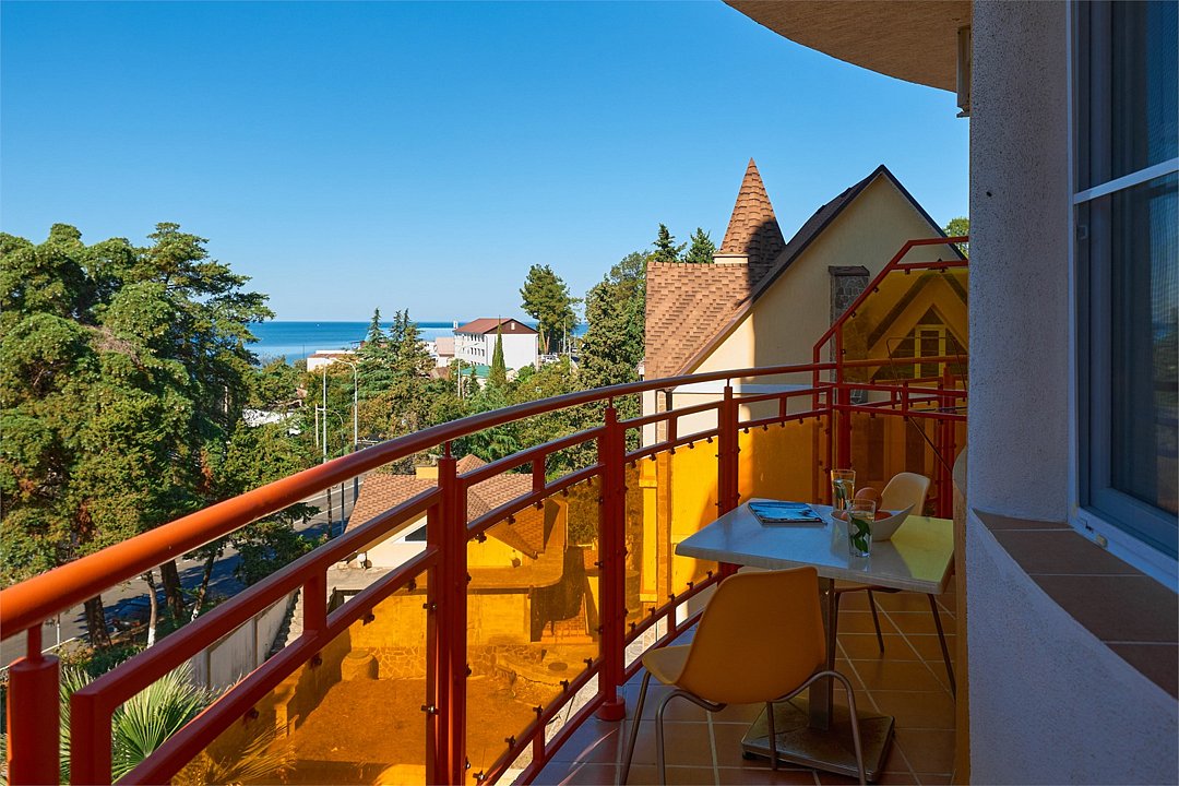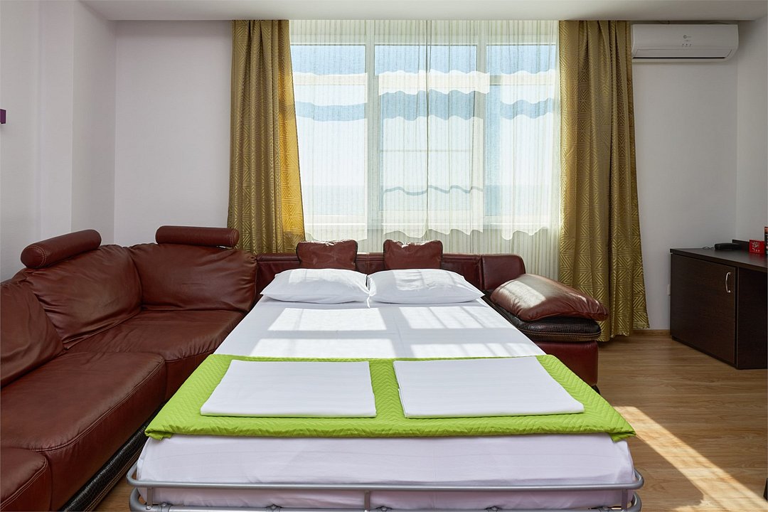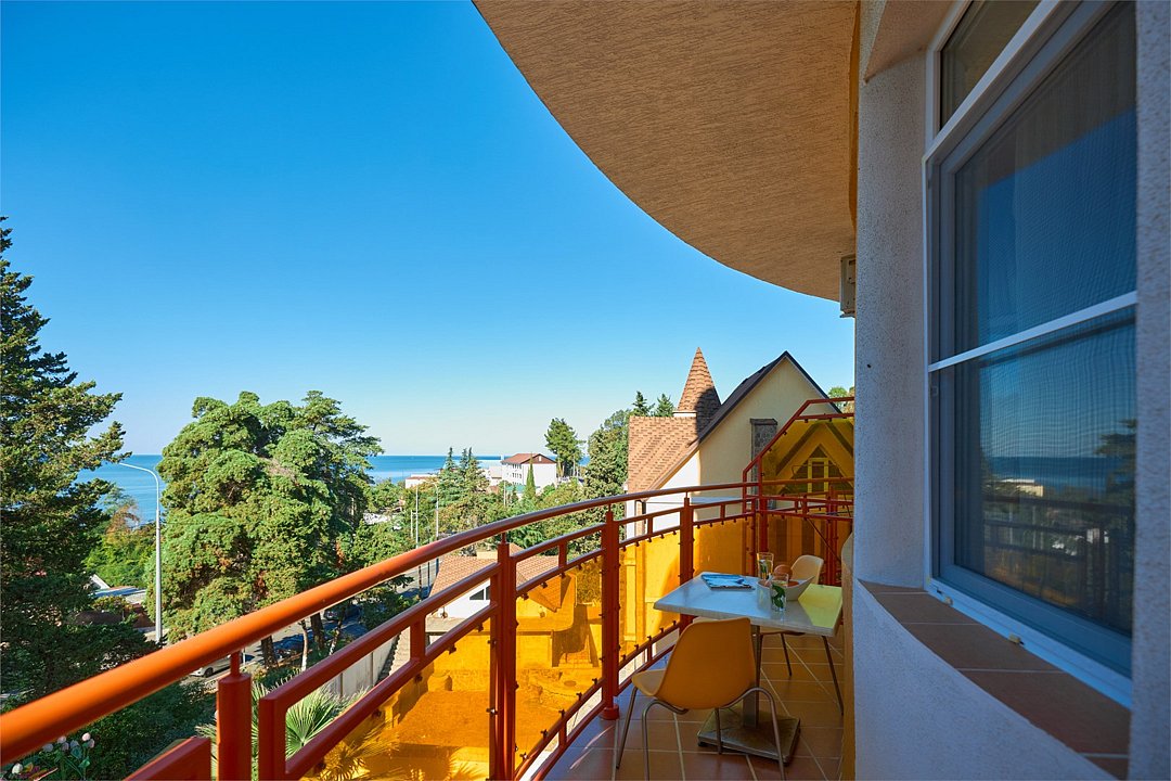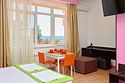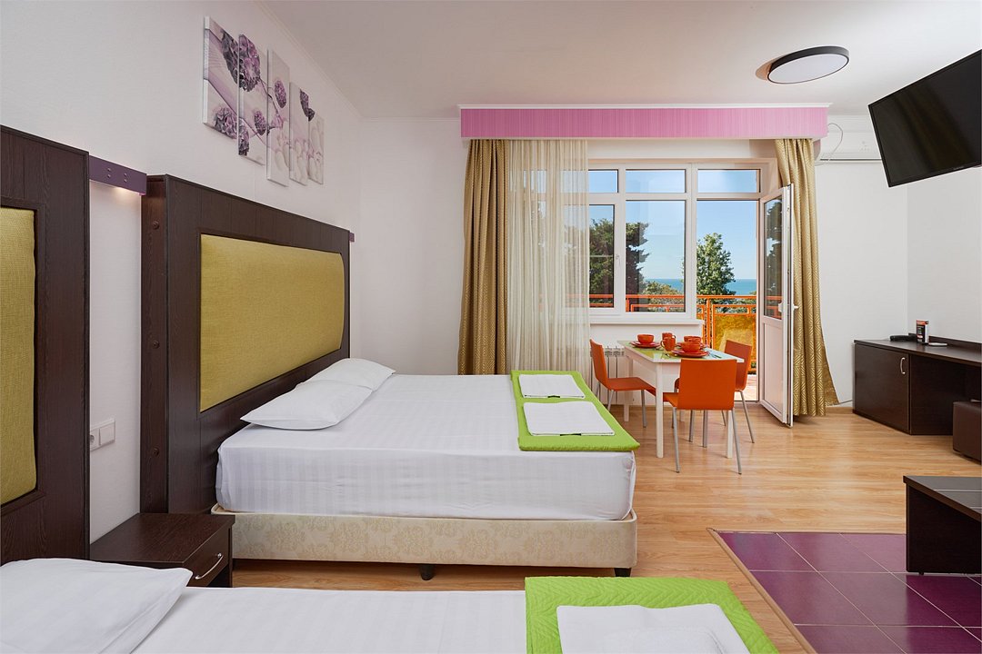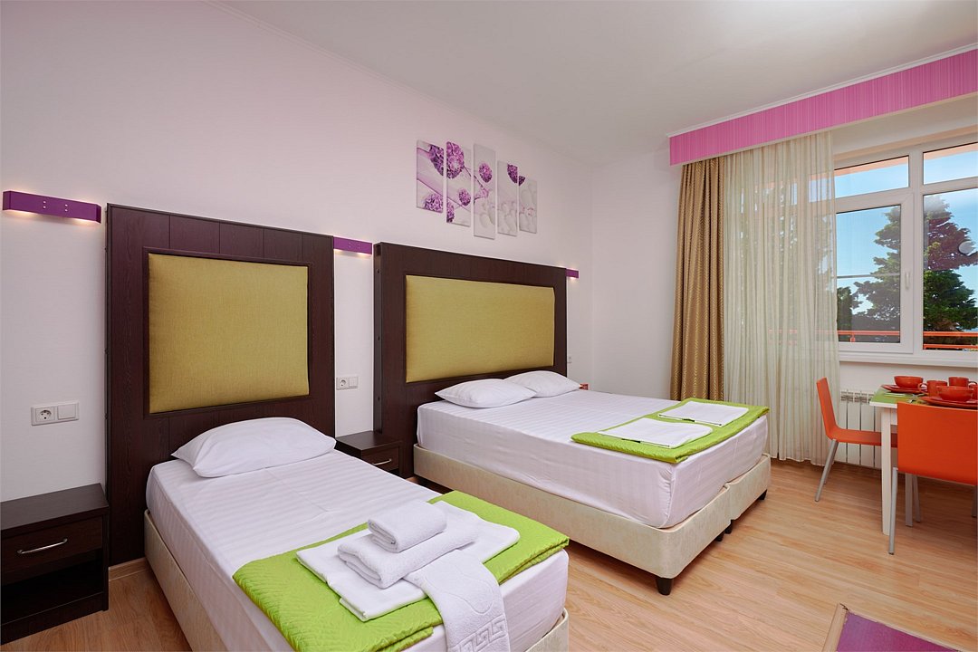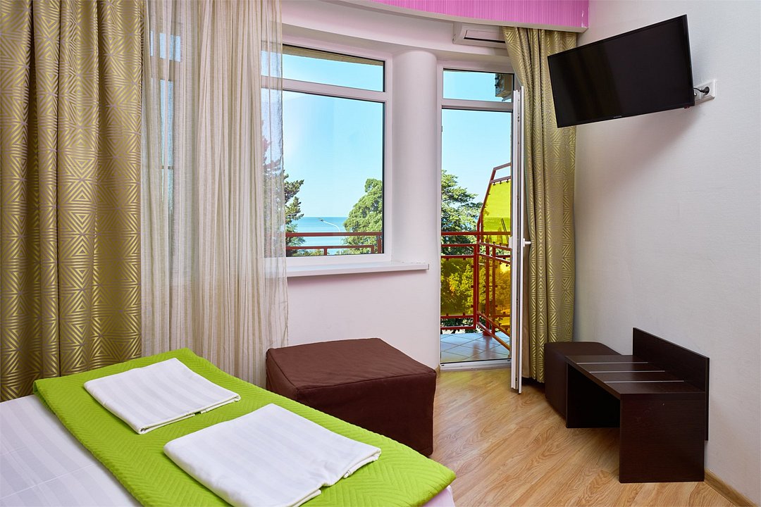 Стандарт семейный 2х местный номер с одной двуспальной кроватью или 2мя раздельными кроватями из окон которого открывается вид на береговую линию моря, а в вечернее время можно любоваться картиной солнечного заката в морской горизонт, сидя на балконе номера. Номер подходит для размещения 3-х гостей . Для размещения 3 го гостя в номере есть пуф, трансформирующийся в полноценное спальное место. В номере есть столовая посуда и столовые приборы, прохладу в нем обеспечивает сплит-система, окна оснащены москитными сетками. Возможно размещение ребенка 3-6 лет на кровати с родителями или люля для ребенка 0-3 года.Услуги и удобства