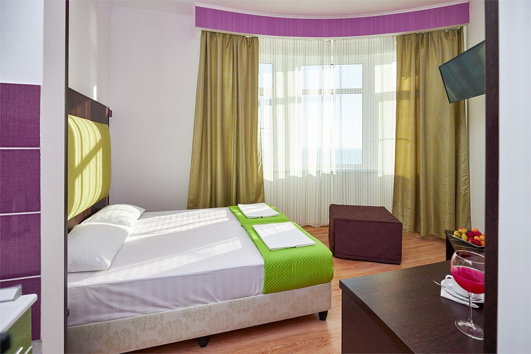 Стандартный 2х местный номер с одной двуспальной кроватью, с балкона которого открывается вид на береговую линию моря, а в вечернее время можно любоваться картиной солнечного заката в морской горизонт. Номер подходит для размещения 2 гостей предпочитающих засыпать в одной постели. В номере есть столовая посуда и столовые приборы, прохладу в нем обеспечивает сплит-система, окна оснащены москитными сетками. Возможно размещение ребенка 3-6 лет на кровати с родителями или люля для ребенка 0-3 года.Услуги и удобства