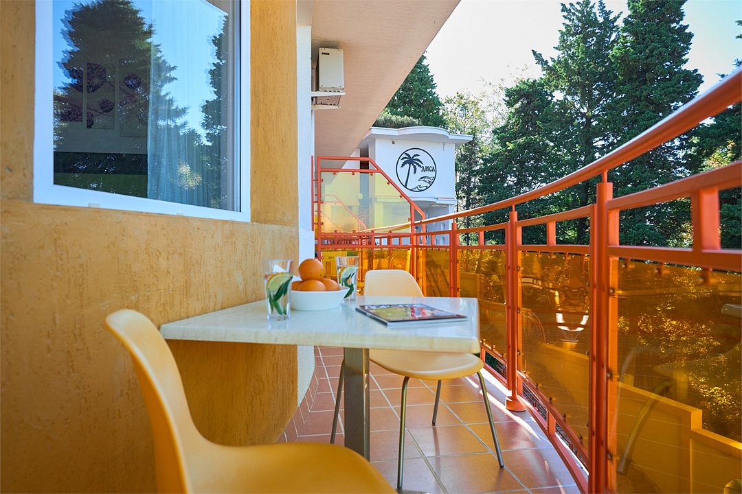 2-х местный номер Делюкс с балконом подойдет для размещения 2х гостей, предпочитающих тихий отдых и вид на цветущий сад отеля и пруд с водопадом, в котором живут черепахи и яркие карпы Кои. Для размещения 3го гостя в номере есть пуф, трансформирующийся в полноценную дополнительную кровать. Оборудован мини-кухней со столовой посудой. В ванной комнате номера кроме душа имеется ванна с поручнями. На балконе номера есть садовая мебель. Возможно размещение ребенка 3-6 лет на кровати с родителями или люля для ребенка 0-3 года.Услуги и удобства