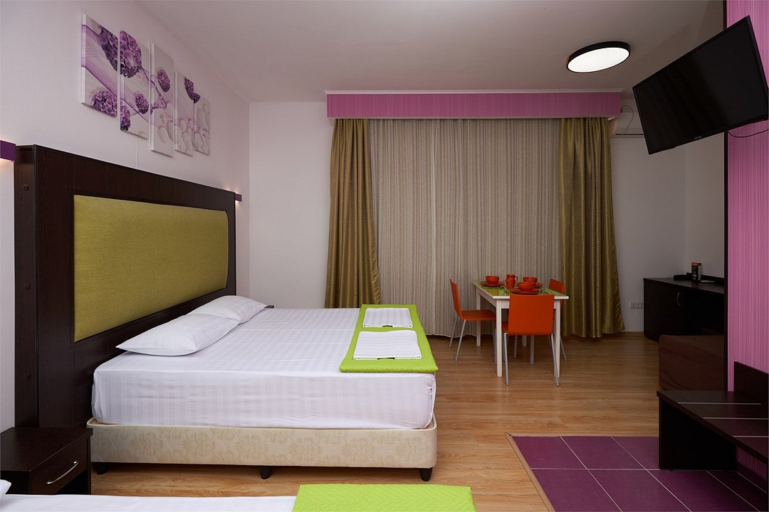 Wi-Fi, фен, будильник, электронные замки, ванная комната, санузел, пляжные полотенца, тапочки, гигиенические средства, две односпальные или большая двуспальная кровать, тумбы, стулья, шкаф для одежды, вешалки, письменный стол, багажная тумба, зеркало, набор посуды, обслуживание номеров, чайник, унитаз, раковина, отопление, душ, вид на море, ламинат, кухонная посуда, стаканы, столовые приборы, туалетные средства, туалет, сплит-система, внутренний телефон, телевизор с плоским экраном, мини-холодильник, мини-кухня, москитная сетка, гостиничная парфюмерия, общественный бассейнВ номере
