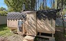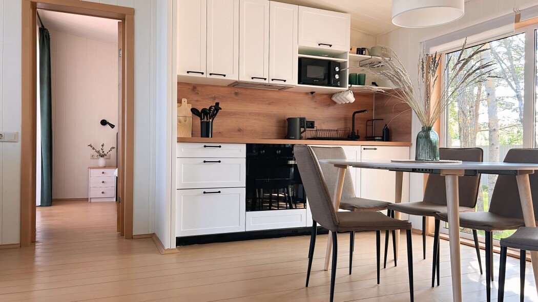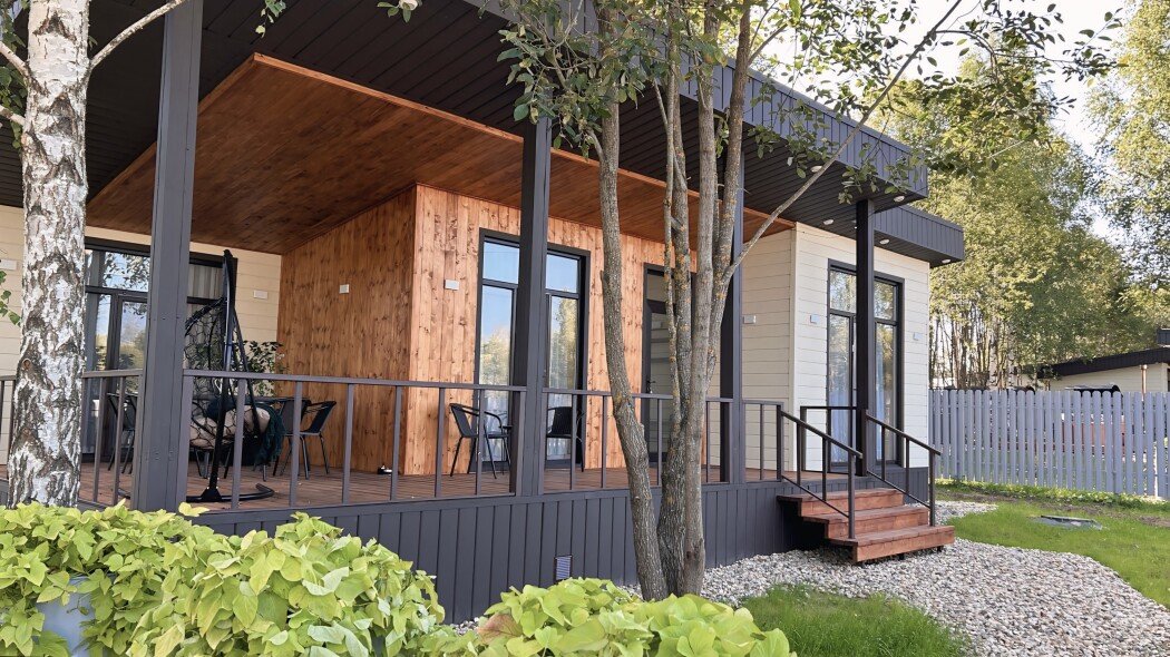 Уютный дом с открытой верандой с панорамными окнами, столом и шестью стульями, собственной баней (оплачивается отдельно) и подогреваемой купелью (оплачивается отдельно).