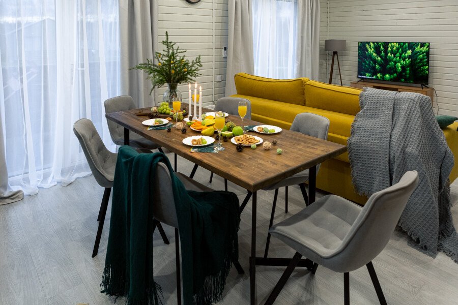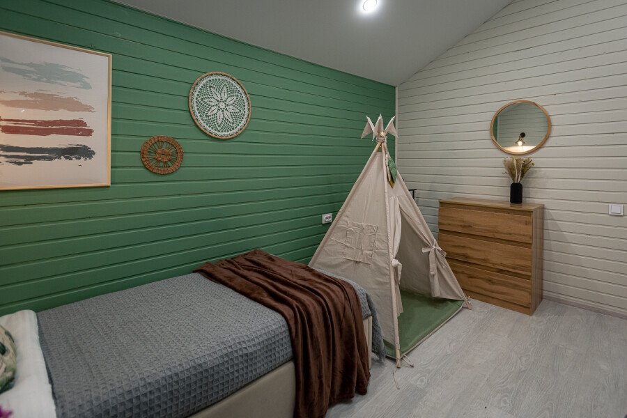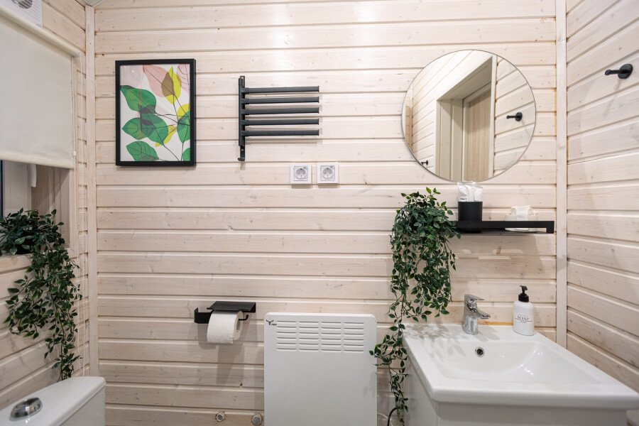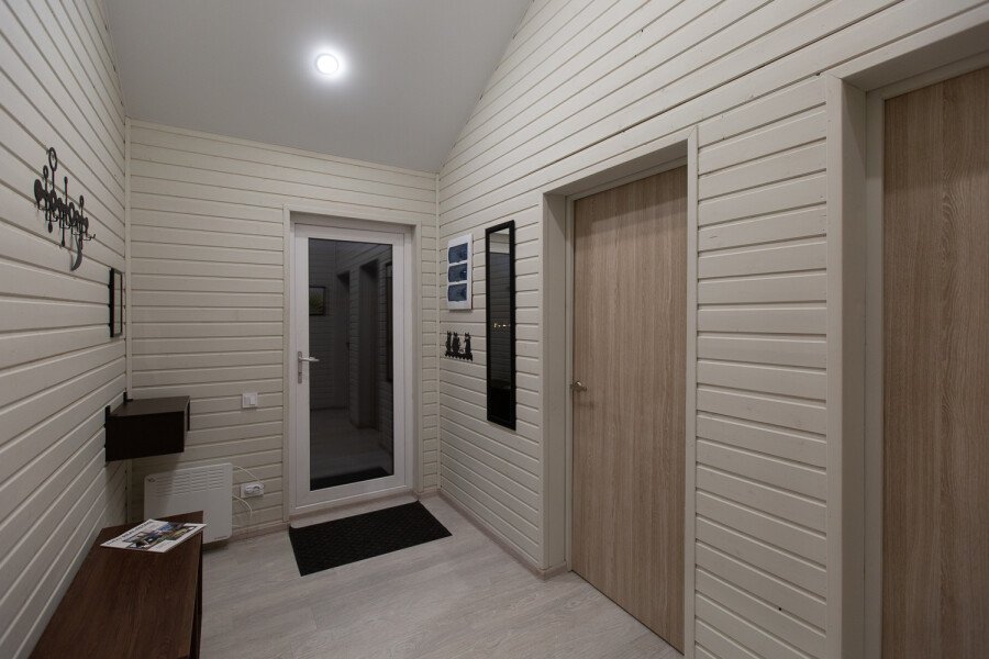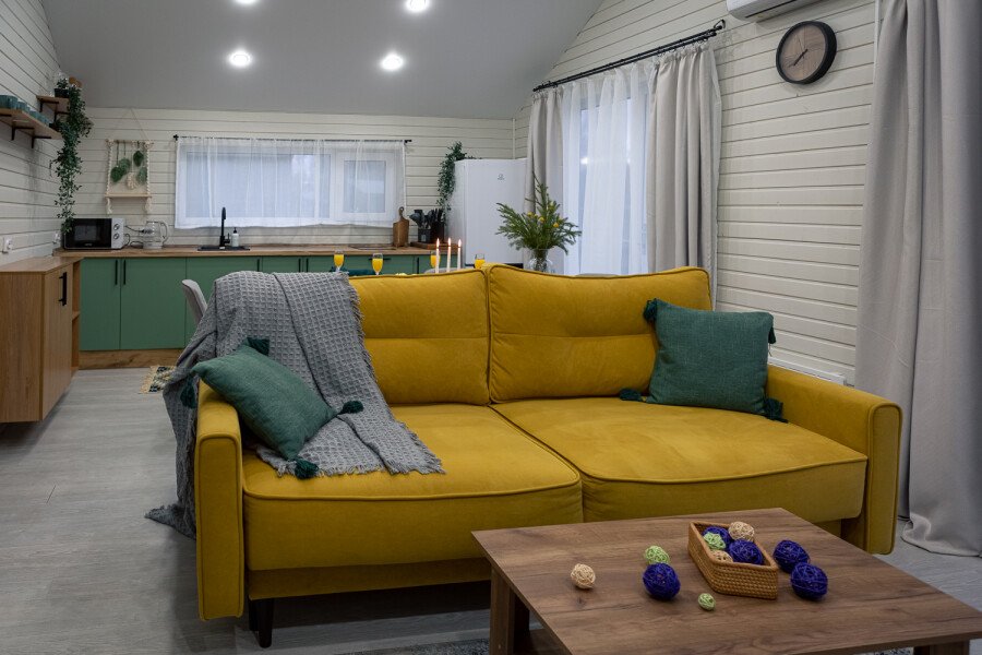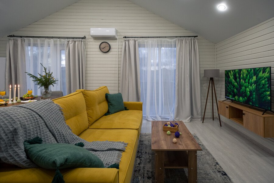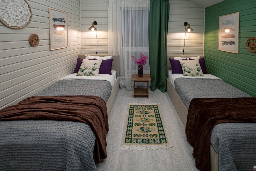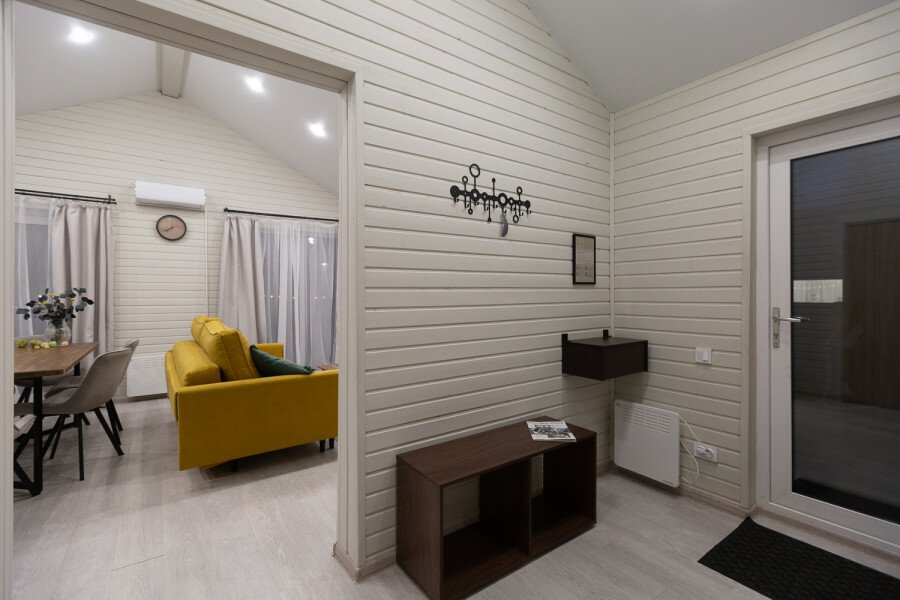 Каждая деталь интерьера продумана для максимального удобства: белоснежное постельное белье, ортопедические матрасы и современные удобства, такие как кондиционер и холодильник с морозильной камерой. Гостям предоставляются банные полотенца, набор косметических средств и тапочки для полного расслабления.
