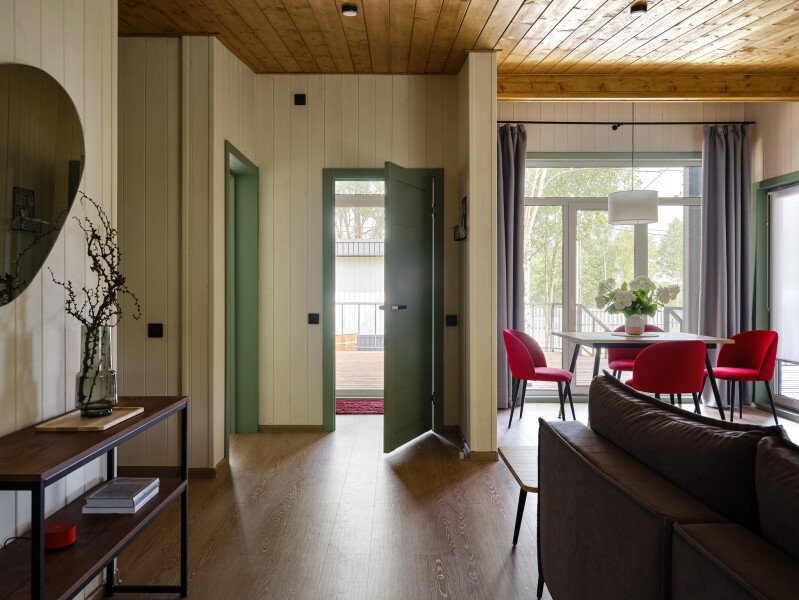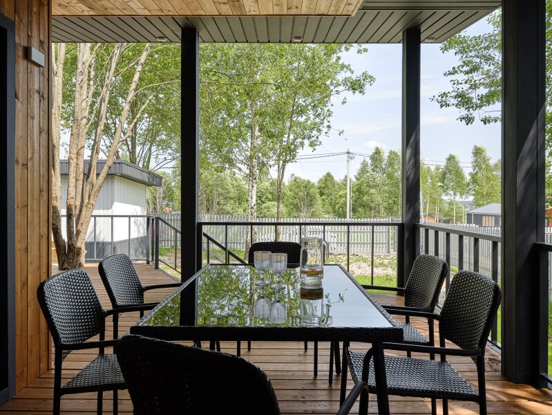 Частный дом «FlatPoint Рябиновый» расположен в живописном коттеджном поселке Грин Лаундж, окруженном зелеными березами и всего в нескольких минутах от живописного водохранилища. Открытая веранда с панорамными окнами создает атмосферу уюта и расслабления, где гости могут наслаждаться трапезой на свежем воздухе.