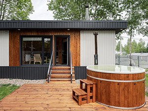 Уютный дом с открытой верандой с панорамными окнами, столом и шестью стульями, собственной баней (оплачивается отдельно) и подогреваемой купелью (оплачивается отдельно).