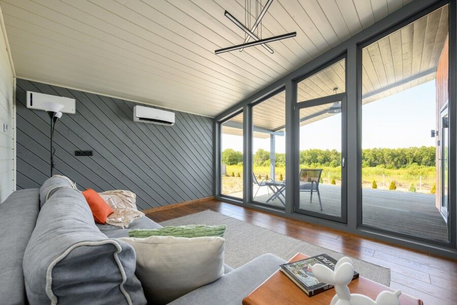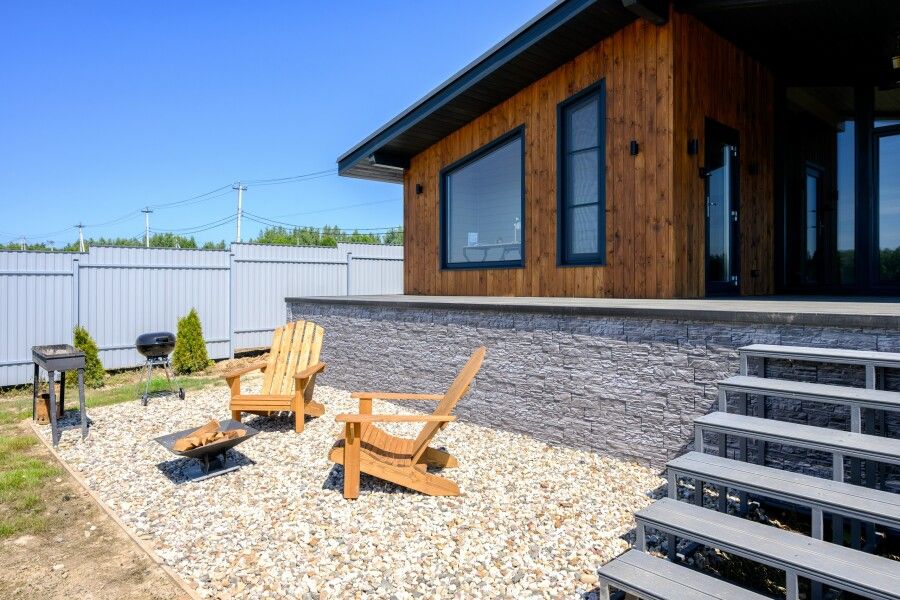 Просторные панорамные окна дома открывают захватывающие виды на окружающую природу, создавая атмосферу умиротворения. Внутри гостей ждут две комфортабельные спальни и светлая гостиная, наполненная естественным светом. Полностью оборудованная кухня позволит приготовить любимые блюда, используя все необходимые приборы. Для создания уютной атмосферы предусмотрена крытая терраса с мангальной и костровой зоной.
