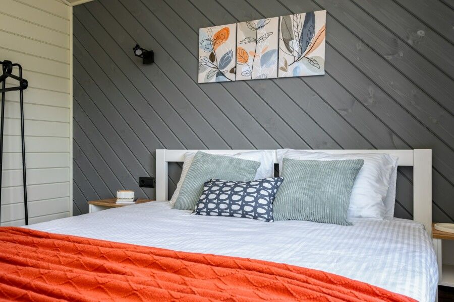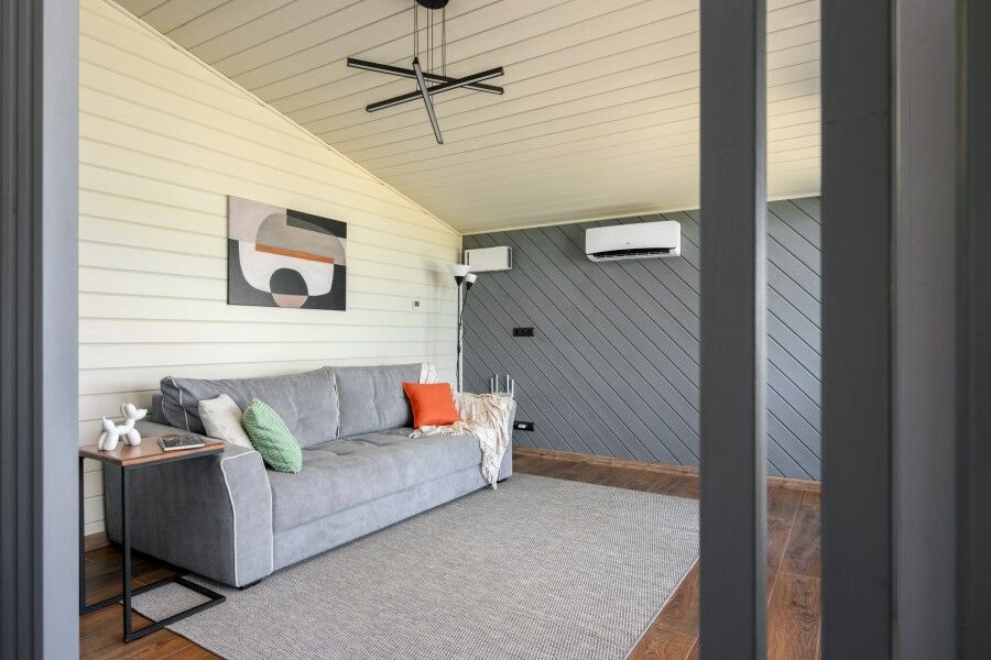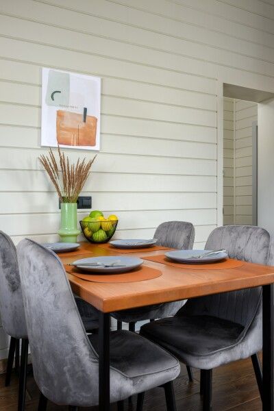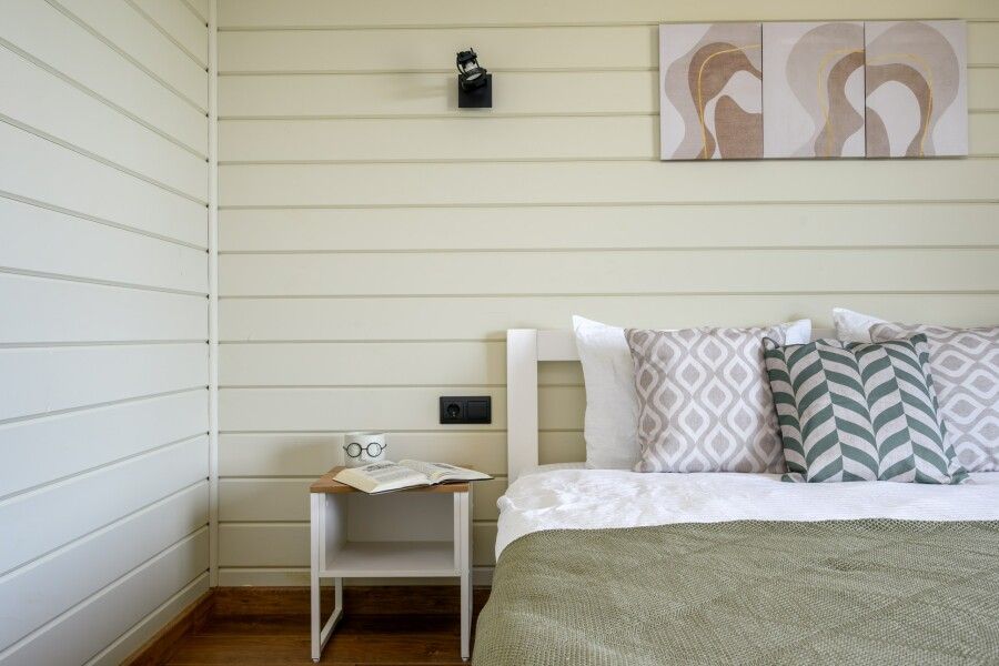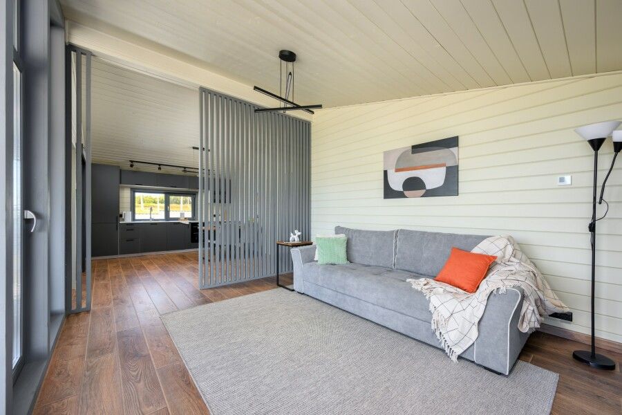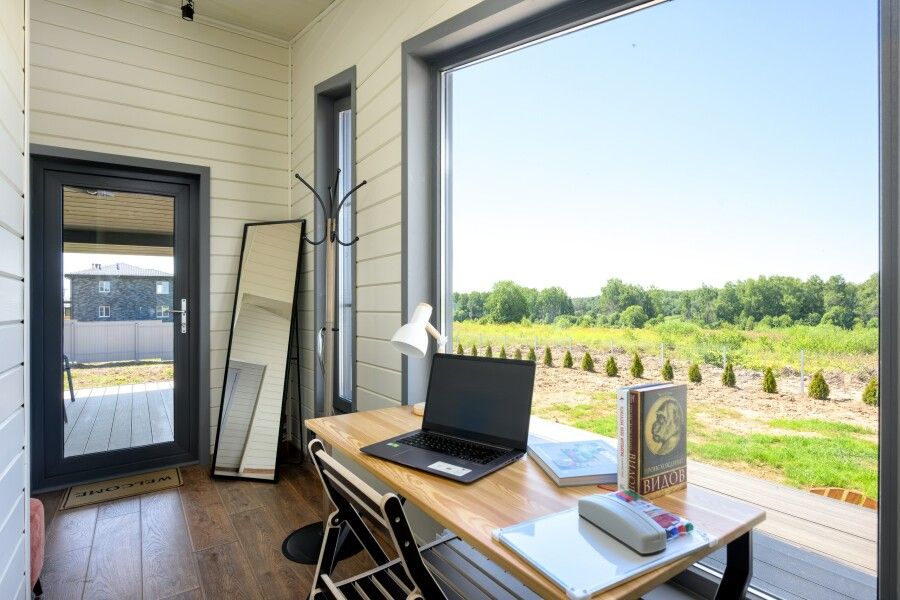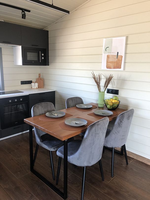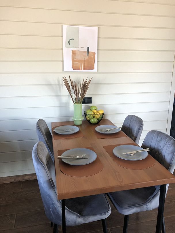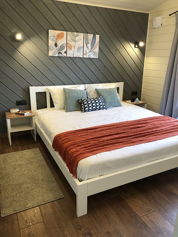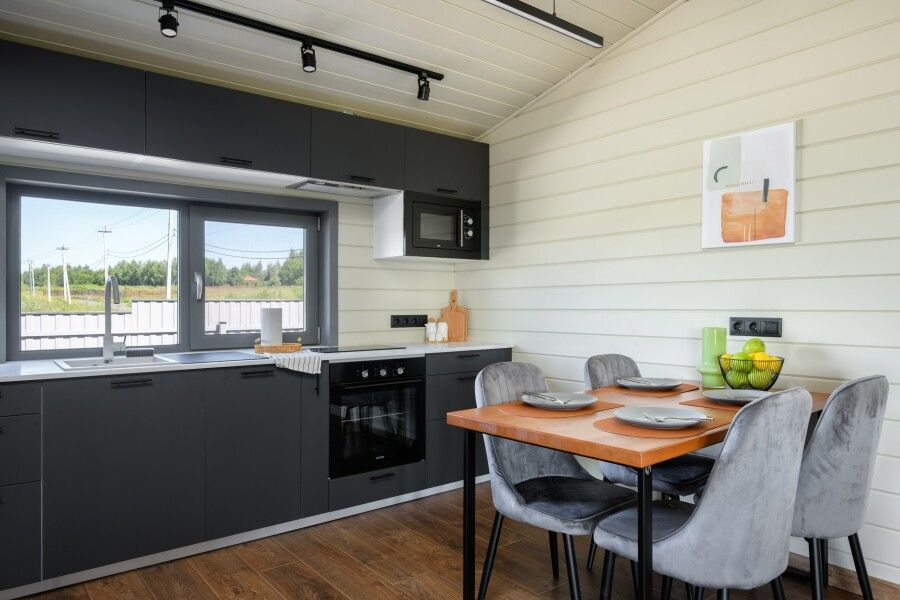 В доме две уютные спальни с комфортными кроватями, просторная гостиная с панорамными окнами, открывающими великолепный вид на окружающую природу, а также полностью оборудованная кухня для приготовления Ваших любимых блюд. В доме есть крытая терраса, мангальная и костровая зона. Для тех, кто любит сочетать работу с отдыхом, есть удобное рабочее место и стабильный Wi-Fi. Дом рассчитан на 4–6 человек. Две 2-спальные кровати 180х200 см, в гостиной раскладной диван на 2-х человек. Площадь дома вместе с верандой 110 м².