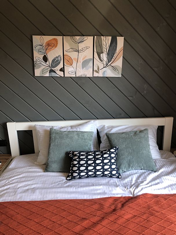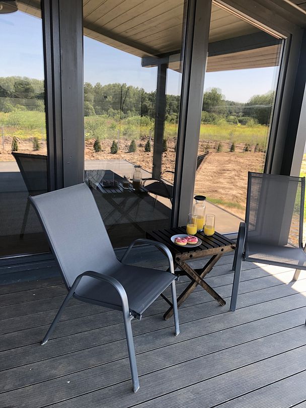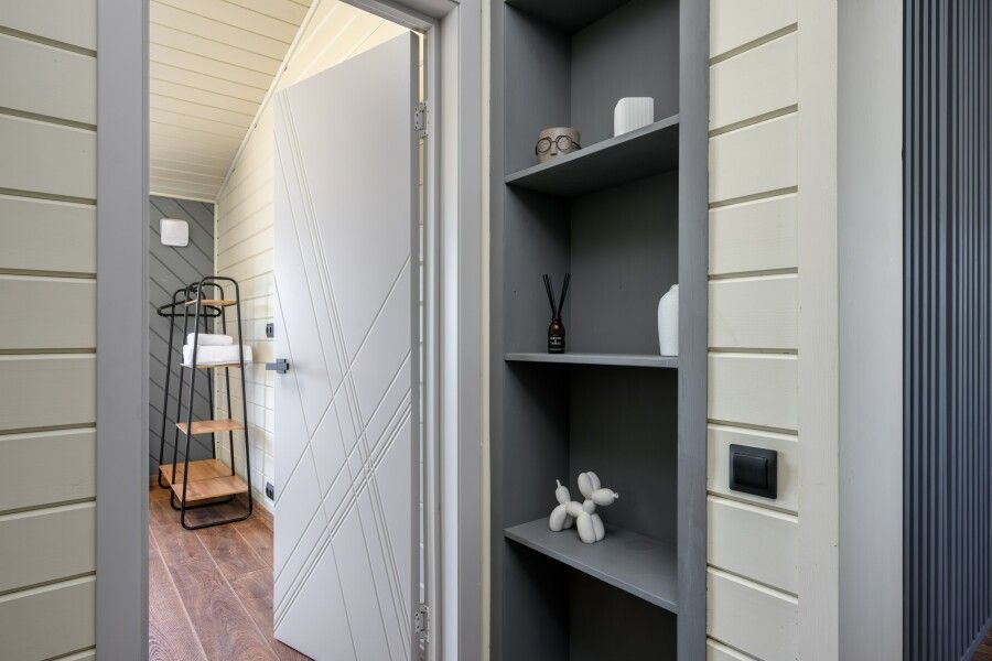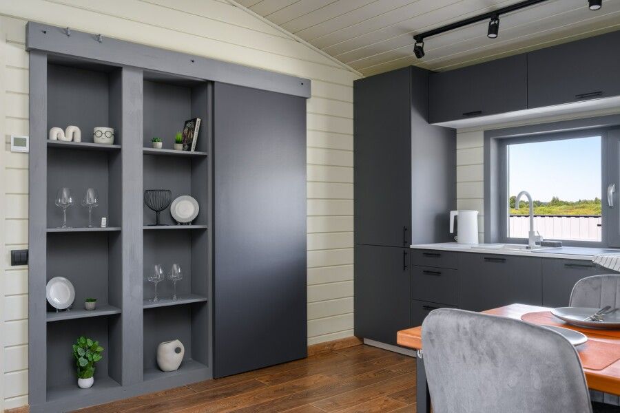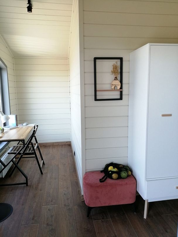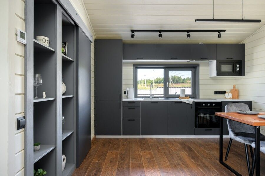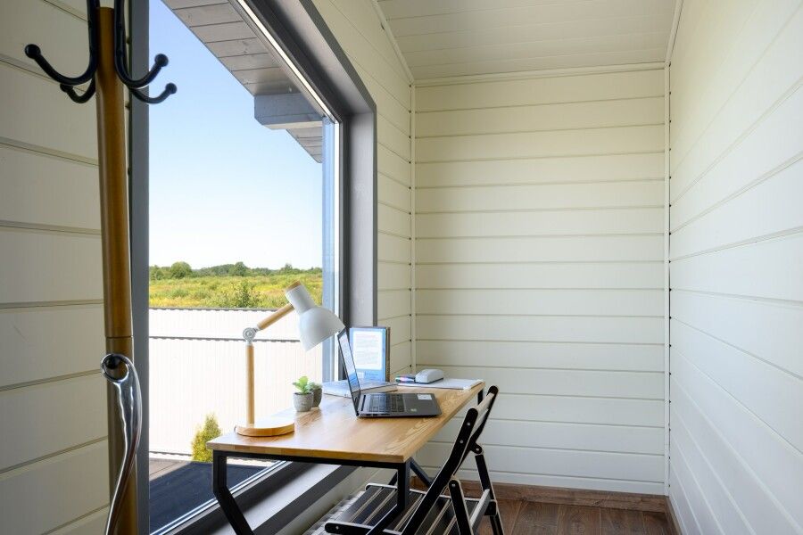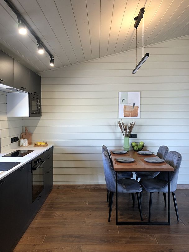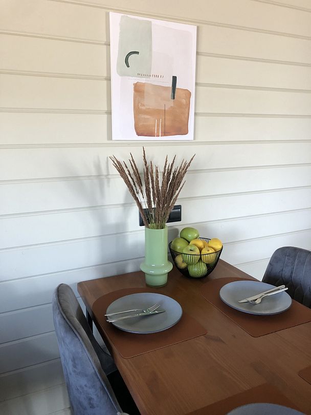 В доме две уютные спальни с комфортными кроватями, просторная гостиная с панорамными окнами, открывающими великолепный вид на окружающую природу, а также полностью оборудованная кухня для приготовления Ваших любимых блюд. В доме есть крытая терраса, мангальная и костровая зона. Для тех, кто любит сочетать работу с отдыхом, есть удобное рабочее место и стабильный Wi-Fi. Дом рассчитан на 4–6 человек. Две 2-спальные кровати 180х200 см, в гостиной раскладной диван на 2-х человек. Площадь дома вместе с верандой 110 м².