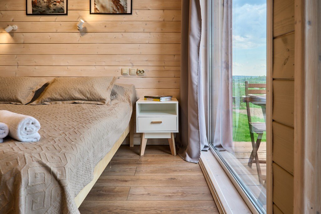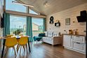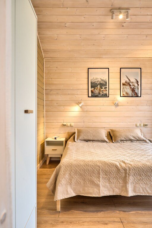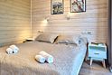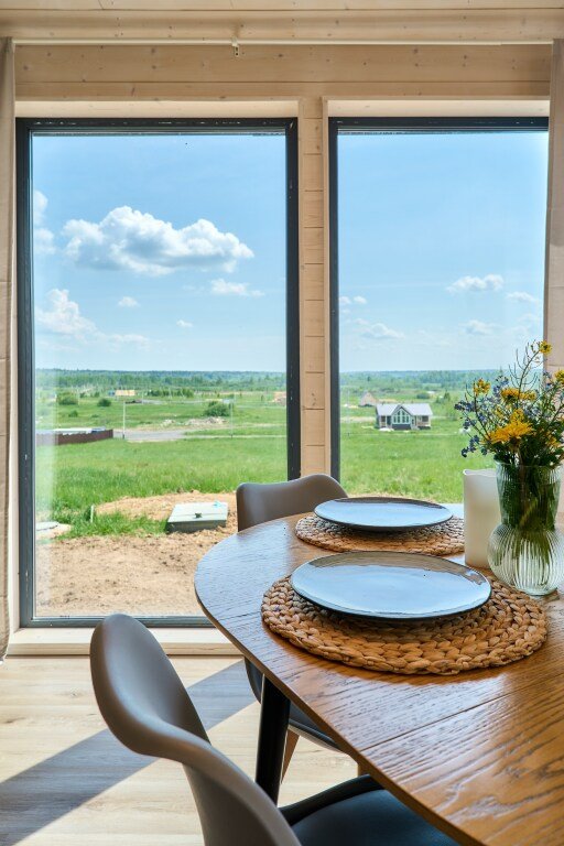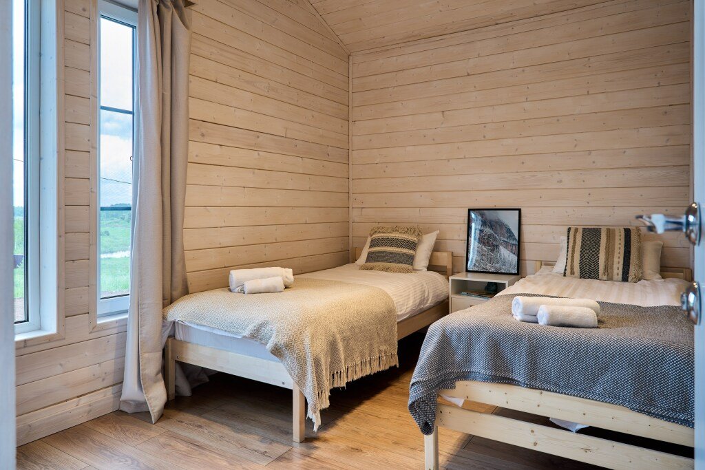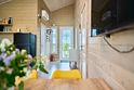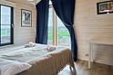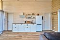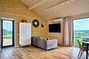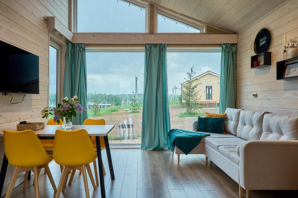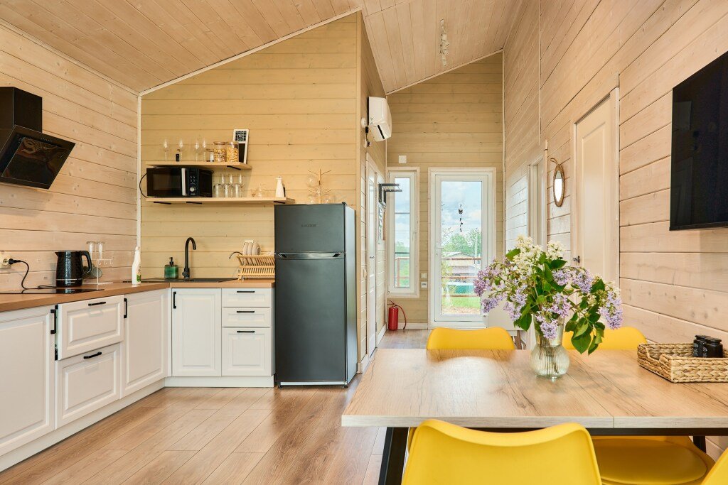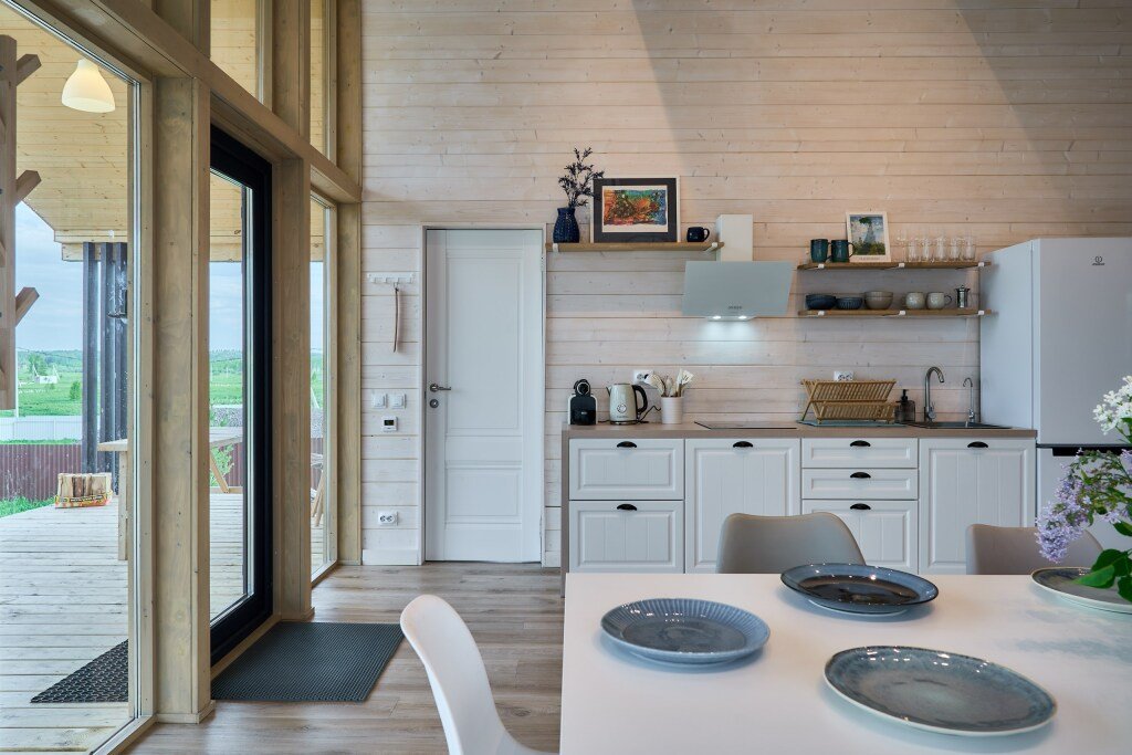 В доме две спальни. Гостиная в доме совмещена с кухней, отсюда открывается панорамный вид. В кухонной зоне имеются холодильник, микроволновая печь, чайник, набор посуды на 6 персон.